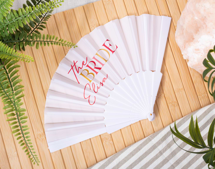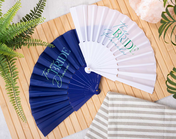 Una buena despedida de soltera que se celebra en verano, se merece que la novia y sus amigas lleven su propio abanico personalizado. Es el accesorio perfecto para huir del calor y ser las más icónicas de cualquier lugar al que vayáis. Y es que como amigas de la novia y organizadoras de este gran evento, estos originales abanicos son perfectos para sorprender a la reina de la despedida de soltera. Vais a poder elegir el color que más os guste (azul oscuro o blanco) o combinarlos para tener un mix de ambos. ¡Y cada uno puede tener su propio diseño! Gracias a nuestro selector de cantidad, podrás añadir cuántas unidades quieres y añadirlas al carrito. Después, encárgate de personalizar cada abanico con el diseño del color que tú quieras y añade el nombre de la novia y cada invitada en ellos. ¡Serán el accesorio perfecto! Material: plástico. Medida: 42 x 23 centímetros.