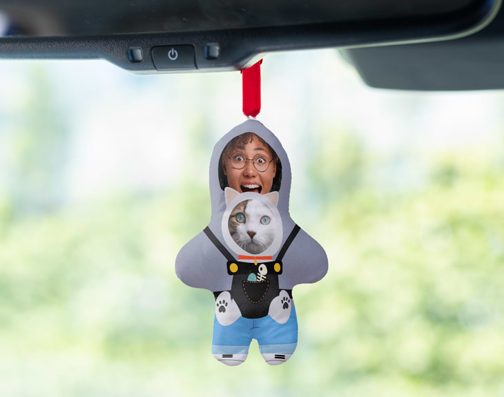 ¿Buscas el regalo perfecto para una madre o un padre gatuno? ¡Lo tenemos! Un adorno para el coche personalizado con un diseño tan divertido como adorable: el portagatos. Sí, lo has leído bien. Hemos transformado el clásico portabebés en una versión felina para que puedas llevar (al menos en espíritu) a tu gatito contigo a todas partes. Cada vez que mires el espejo retrovisor, sonreirás al ver a tu pequeño minino colgando felizmente. Este peluche colgante original es mucho más que un accesorio para coche: es una declaración de amor gatuno. Ideal para decorar tu coche, y perfecto para sorprender a cualquier amante de los gatos con un detalle único que no se encuentra en tiendas comunes. Y lo mejor de todo es que puedes personalizar este adorno colgante con tu propia cara y la de tu gato. Solo entra en el área de personalización, elige el diseño que más te guste y crea un recuerdo inolvidable. Es divertido, entrañable y completamente único. ¡Haz que tu coche ronronee contigo! Medidas del muñeco: 14 x 9 cm. Material: poliéster.
