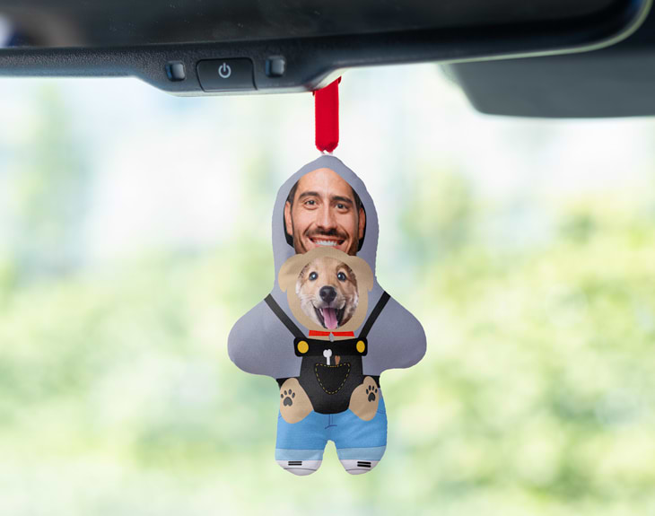 ¿Quieres sorprender a esa persona que no se separa de su perro ni un segundo? Entonces este adorno para el coche personalizado es justo lo que necesitas. Lleva la foto de su peludo y tiene un diseño tan divertido como entrañable: un simpático portaperros inspirado en los clásicos portabebés. ¡Imposible no sonreír al verlo! Este original adorno de muñeco es el detalle perfecto para dejar con la boca abierta a cualquier amante de los perros. Puedes personalizarlo con la cara del dueño y la de su fiel compañero de cuatro patas. Quedará genial colgado del espejo retrovisor y añadirá un toque especial al coche. Para personalizar este peluche colgante, solo tienes que entrar en nuestro diseñador online, subir las imágenes ¡y listo! En pocos pasos tendrás un regalo original y divertido. ¡Haz que su coche sea el más guau de todos! Medidas del muñeco: 14 x 9 cm. Material: poliéster.