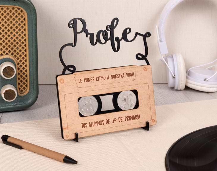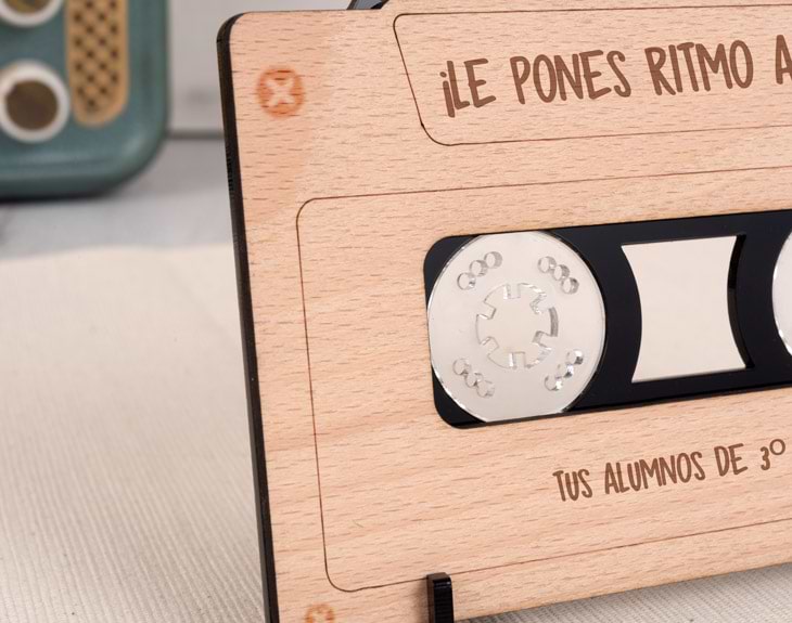 Música es una de las asignaturas que le gusta a casi todo el mundo. Es ese tipo de clase que le encanta a la gente creativa o que quieren aprender sobre melodías, sinfonías y cómo se toca un instrumento. Pero conseguir que a los alumnos les guste esta bonita asignatura, depende mucho del profe. Si este curso habéis tenido a ese profesor o profesora que ama la música y os ha transmitido ese sentimiento, se merece un regalo tan guay como este adorno de madera personalizado. Aunque hoy en día podemos escuchar música a través de Internet, años atrás se necesitaban discos e incluso cassettes. Por eso, este cassette de madera le hará muchísima ilusión a vuestro profe y será un recuerdo único. Cualquier profe que consiga que disfrutes con su asignatura, se merece un reconocimiento por su trabajo y su vocación. Este original cassette de madera será un detalle muy especial para el mejor profe de música que habéis tenido este año. Seguro que no se espera recibir este regalo hecho de madera y metacrilato desde cero y personalizado por todos su alumnos. ¡Quedará genial en cualquier rincón! Personalizar este adorno es muy sencillo. Añade el producto al carrito y entra en el área de personalización. Ahí podrás escribir el texto que quieras en los espacios vacíos y colocarlos a tu gusto. Además, en la parte superior de este adorno está escrita la palabra 'profe' en metacrilato negro, para dejar claro a quién va dirigido este regalo. Una vez hecho esto... ¡Este cassette de madera estará listo para regalar! Medidas del adorno: 14 x 9 cm.