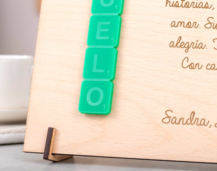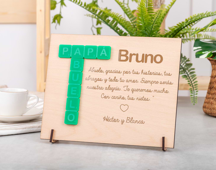 ¿Tienes la suerte de que tus hijos crezcan con el amor de su abuelo? ¡Entonces este marco de madera personalizado con el diseño "Papá/Abuelo" es el regalo perfecto! Un detalle lleno de cariño y significado. Con su diseño inspirado en el Scrabble, este marco será el toque perfecto para cualquier rincón de la casa o incluso en el escritorio del abuelo, donde siempre lo podrá tener cerca. Este marco personalizado te da la oportunidad de poner el nombre de tu papá y de añadir los de todos los nietos debajo. Así, cada vez que lo mire, sentirá el cariño de su familia. Un regalo original para el Día del Padre que también celebrará su papel como abuelo, ¡y sin duda será un detalle que no olvidará! Personalizarlo es muy fácil. Solo tienes que añadir el producto al carrito, entrar al área de personalización y completar los campos en blanco con el texto que prefieras. ¡Nosotros nos encargamos de crear el regalo más especial para papá y abuelo! Medidas: 24 x 18,7 cm.