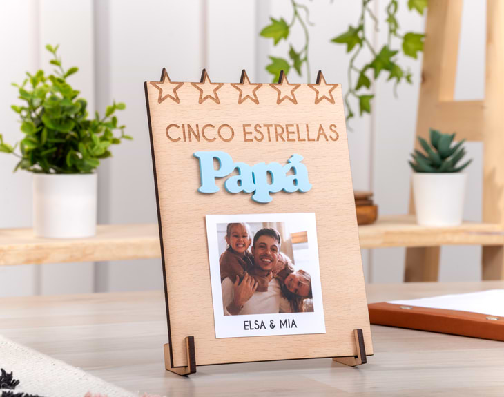 ¿Ya sabes qué regalarle a papá este año? Si aún no has encontrado el detalle perfecto, no te preocupes, ¡tenemos la mejor idea para ti! Nuestro marco de madera personalizado con foto es el regalo ideal para un Día del Padre inolvidable. Es una forma única de agradecerle todo lo que hace por su familia y de demostrarle todo el cariño que le tenéis. ¡Le encantará! Con un diseño exclusivo de "Papá cinco estrellas", este original marco lo dejará sin palabras. Si buscas un detalle especial y diferente, este regalo de madera es justo lo que necesitas. Podrá colocarlo en cualquier rincón de la casa, ya que encajará perfectamente en cualquier espacio. Además, podrás personalizar la foto polaroid y escribir debajo de ella vuestros nombres o un breve mensaje. ¡Será el toque perfecto! Y ahora llega lo mejor: ¡personalizar este increíble regalo de madera es muy sencillo! Solo añade el producto al carrito, entra en el área de personalización y sube vuestra foto favorita. Después, escribe lo que quieras debajo de la polaroid. Nosotros nos encargamos de que quede impecable y listo para sorprender a papá. ¡Será el mejor regalo del mundo! Medidas: 14 x 19 cm.