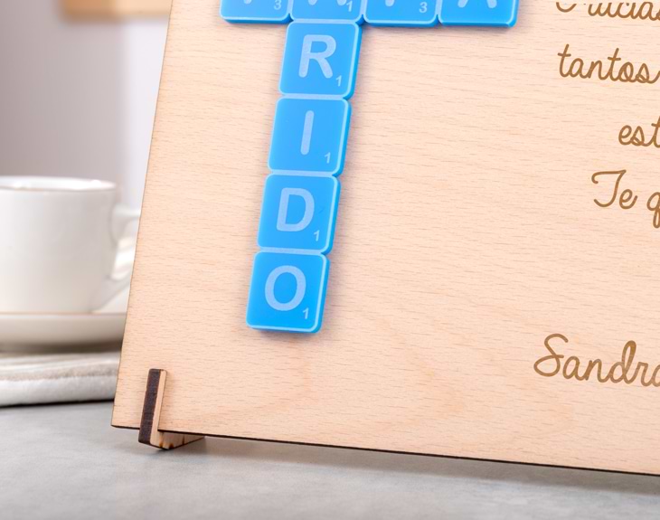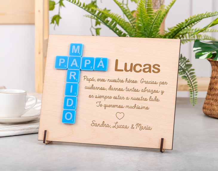 ¿Tienes la suerte de haber formado familia con el amor de tu vida? Porque antes de ser papá, fue marido… ¡y el Día del Padre es la ocasión perfecta para demostrarle el amor que tienes por él y el cariño de los hijos por su papá! Sorpréndelo con nuestro marco de madera personalizado con el diseño "Papá/Marido", inspirado en el Scrabble. Este detalle único quedará genial en cualquier rincón de la casa o en su escritorio, ¡y papá podrá tenerlo siempre cerca! Con un mensaje bonito y lleno de significado, puedes personalizar este adorno con el nombre de tu papá y añadir los nombres de todos los miembros de la familia debajo. Este Día del Padre se convertirá en un momento muy especial gracias a este regalo tan emotivo. Personalizar este original marco es muy sencillo. Solo tienes que añadir el producto al carrito, entrar al área de personalización y completar los espacios en blanco con el texto que más te guste. ¡Nosotros nos encargaremos de que el regalo más original para papá llegue a tiempo! Medidas: 24 x 18,7 cm.