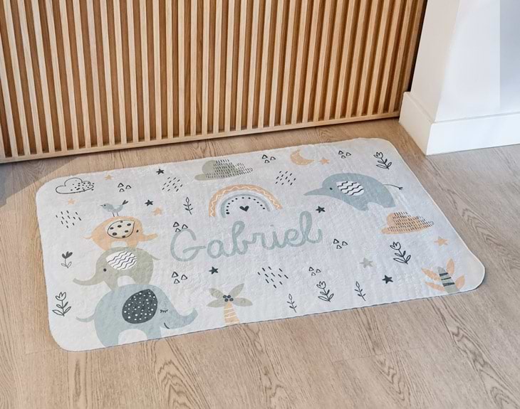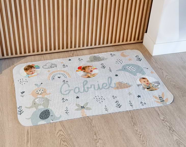 Las alfombras son el accesorio perfecto para decorar cualquier rincón vacío de nuestra casa. Consiguen aportar a nuestro hogar un toque acogedor y cálido, especialmente en invierno cuando hace frío. Si estás pensando en darle un toque especial al cuarto del pequeño de la casa, esta alfombra rectangular personalizada llena de adorables elefantes en tonos azules, es perfecta para decorar su habitación. Le encantará ver que tiene una alfombra hecha a medida y con detalles muy especiales. ¡Es el mejor regalo del mundo! Esta original alfombra es genial para sorprender a los más pequeños de la casa el día de su cumpleaños o en cualquier celebración especial. Seguro que se emocionan al recibir una alfombra llena de adorables y coloridos elefantes y en la que además podrán ver su nombre y también, dependiendo la opción que quieras, algunas de sus fotos favoritas. Será perfecta para colocarla en su habitación y que puedan sentarse y jugar sobre ella porque es súper suave y muy cómoda. ¡Les encantará! Pero todavía no hemos terminado, no te olvides que antes de recibirla tienes que personalizar tu propia alfombra. Podrás elegir dos personalizaciones distintas: en la primera solo tendrás que añadir y colocar el nombre que quieras entre los elefantes y en la segunda podrás añadir el nombre que quieras y tus tres fotos favoritas para tenerlas siempre de recuerdo. ¿Cuál prefieres? ¡Todo el mundo querrá una igual! Material: fibra sintética extra-suave y antideslizante por la parte de abajo. Medidas del ancho de la alfombra: Grande: 104 x 65 cm. Mediana: 90 x 56 cm.