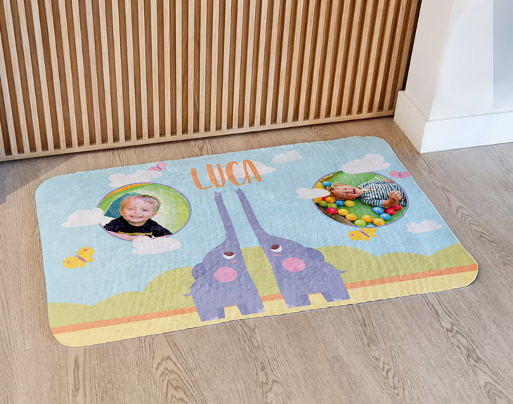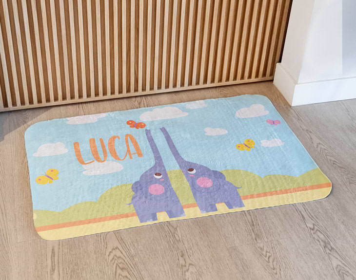 Seguro que a los más pequeños de la casa les encanta jugar en el suelo con todos sus juguetes y moverse de un lado para otro sin parar. Por eso, para evitar que tengan frío y se pongan malos, es importante que jueguen sobre alguna superficie que no sea el suelo y más en invierno cuando hace mucho frío. Por eso, la mejor opción es decorar su cuarto con esta preciosa alfombra rectangular personalizada que le dará un toque muy divertido, personal y acogedor. Seguro que les encanta a los más peques este diseño con dos elefantes monísimos, nubes y mariposas. ¡El diseño perfecto que le encantará a todos los niños! Si estás pensando en decorar de nuevo la habitación de tus hijos o darle un toque especial y diferente, esta original alfombra es un acierto seguro para todas las estancias y combina con cualquier decoración. Este adorable diseño está pensado para los reyes de la casa, los niños y les encantará poder jugar sobre esta alfombra que es muy suave además de cómoda. Es el regalo perfecto para sorprender a tus hijos, nietos, sobrinos en su cumpleaños o cualquier fecha o evento especial. Pero antes de terminar, no te olvides que tienes que personalizar esta alfombra para que sea única. Podrás elegir qué tipo de personalización quieres: la alfombra únicamente con el nombre o la alfombra con nombre y fotos. ¿Qué diseño te gusta más? Solo tendrás que añadir el producto al carrito, entrar en el apartado de personalización y escribir el nombre que quieras o añadir tus fotos favoritas. Solo queda recibirla y colocarla donde más te guste. Material: fibra sintética extra-suave y antideslizante por la parte de abajo. Medidas del ancho de la alfombra: Grande: 104 x 65 cm. Mediana: 90 x 56 cm.