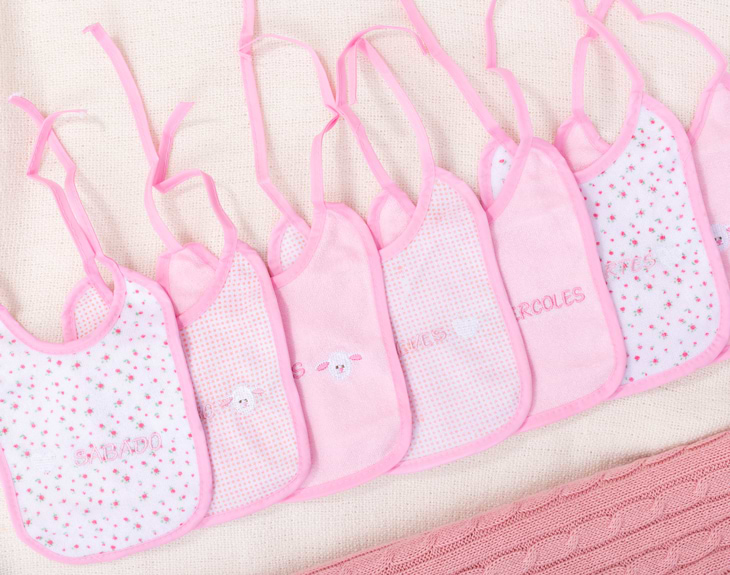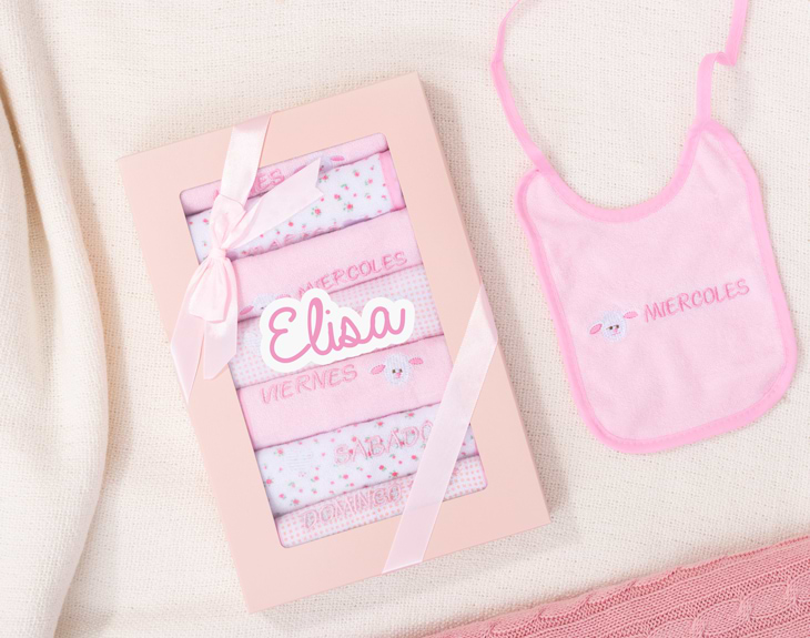• Set de baberos para toda la semana personalizado. • Tarjeta Recordatoria.