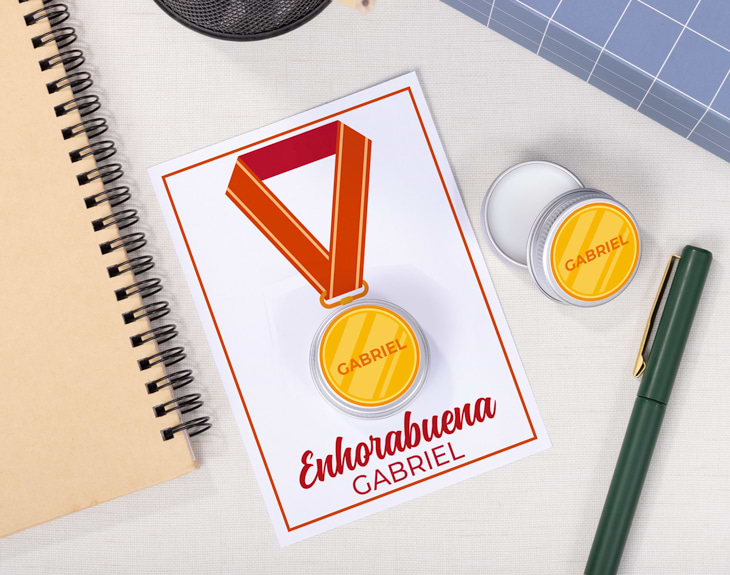 Después de unos meses duros, el curso llega a su fin. Y ahora se acercan las vacaciones de verano. Si este año vuestro profe ha tenido muchísima paciencia y ha sido el mejor de todos, está claro que tenéis que hacerle un regalo a su altura. Y para eso, nuestra tarjeta con bálsamo labial personalizada con diseño "Medalla de oro" es el detalle perfecto. Está claro que el profe se merece una medalla de oro por toda la paciencia que ha tenido. Además, este bálsamo labial con tarjeta es personalizable, podrás escribir el nombre que tú quieras. Imagina la ilusión que le hará recibir este regalo de despedida tan especial, sin duda, le encantará. Personalizar esta tarjeta con bálsamo labial es muy sencillo. El primer paso a seguir consiste en añadir el producto al carrito y entrar al área de personalización. Una vez ahí, ya puedes escribir el nombre que tú quieras. Pronto estará perfecto y listo para regalar. ¡Será un original regalo para fin de curso! Medidas: Diámetro: 4 centímetro. Alto: 1,5 centímetro.