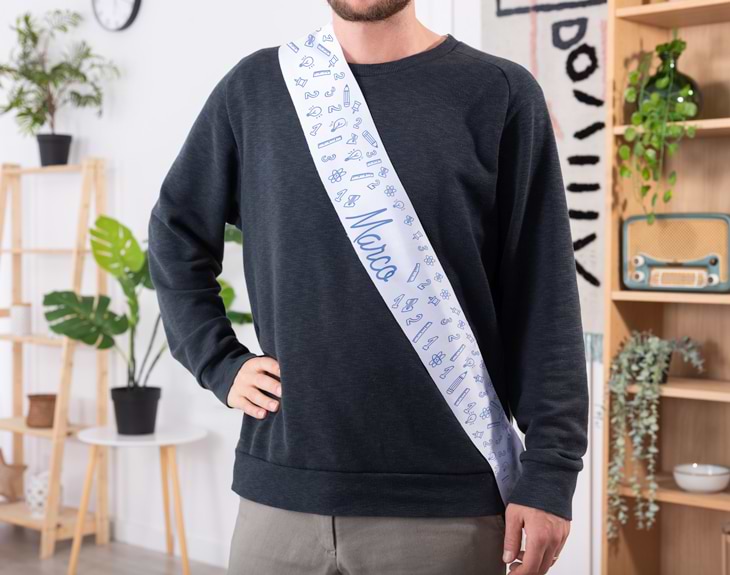 Esos profes que son súper buenos y que se esfuerzan un montón porque sus alumnos aprendan, se merecen lo mejor del mundo. Si este año habéis tenido muchísima suerte con vuestro maestro, está claro que tenéis que hacerle el regalo perfecto. Y para eso, nuestra banda para profes con diseño "Profe garabatos" es ideal. Sorprenderle con este detallito es una preciosa forma de demostrarle lo mucho que habéis disfrutado de sus clases. Imagina la ilusión que le hará recibir esta bando, le encantará. Porque además, es personalizable, podrás escribir el nombre del mejor profe de todos. ¡Quedará genial! Personalizar esta banda para profes es súper sencillo. El primer paso a seguir consiste en añadir el producto al carrito y entrar al área de personalización. Una vez ahí, ya puedes escribir el nombre del mejor profe del mundo. Pronto estará perfecta y lista para regalar. ¡Será un original regalo para profesores! Material: 100% poliéster. Medidas: 80 x 9,5 aprox.