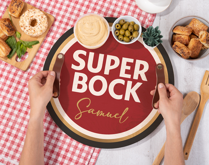 ¿Te encanta ser anfitrión? Si vas a preparar una fiesta casera y quieres dejar con la boca abierta a todos tus invitados... ¡tenemos algo que no puede faltar en tus celebraciones! Se trata de nuestra bandeja de madera personalizada. Es ideal para que puedas trasladar los aperitivos o la bebida de la cocina al salón, ¡es de lo más original y práctica! Además, si en vuestras fiestas caseras, algo que nunca sobra es la cerveza, está bandeja es ideal para estas pocasiones porque tiene estampado la mejor cerveza portuguesa, ¡la Super Bock! Y lo mejor es que es personalizable. ¡Podrás escribir el nombre que tú quieras! Por otro lado, si tú tienes a ese amigo que también es un anfitrión de 10, sorpréndele con esta bandeja tan especial. ¡Será un regalo único! Personalizar esta bandeja redonda es súper sencillo. El primer paso a seguir consiste en añadir el producto al carrito y entrar al área de personalización. Una vez ahí, ya puedes escribir el nombre que tú quieras. Pronto estará perfecto y listo para regalar. ¡Será un original regalo para fans de la cerveza! Medida: 41,5 centímetros de diámetro. Material: madera. Importante: Las maderas tienen vetas y estas quedan reflejadas en la imagen.