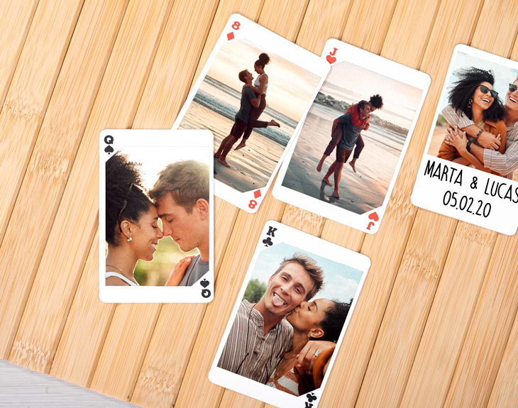 ¿A ti y a tu pareja os encanta disfrutar de una partida de cartas o juegos de mesa? Imagina hacerlo de una manera única y muy especial. ¡Con nuestra baraja de póker personalizada con foto es posible! La clásica baraja francesa, con los tradicionales palos de picas, corazones, diamantes y tréboles, personalizados con la foto que tú elijas. Y, por la parte trasera, un diseño elegante para que el foco esté siempre en el juego. Este regalo es ideal para sorprender a tu pareja en San Valentín, un detalle divertido y original que podréis disfrutar juntos. ¿Y lo mejor de todo? No solo recibirás las cartas, si no que te las enviaremos dentro de una cajita de plástico para que puedas guardarlas y llevarlas donde tú quieras. ¡El regalo perfecto para los amantes de los juegos de naipes! Personalizar esta baraja es muy sencillo. Solo tienes que añadir al carrito la opción que prefieras y entrar en el área de personalización. Desde allí, podrás subir las fotos que elijas para cada palo. ¡Un regalo original para los enamorados! Medidas aproximadas de cada carta: 8,6 x 5,6 cm.