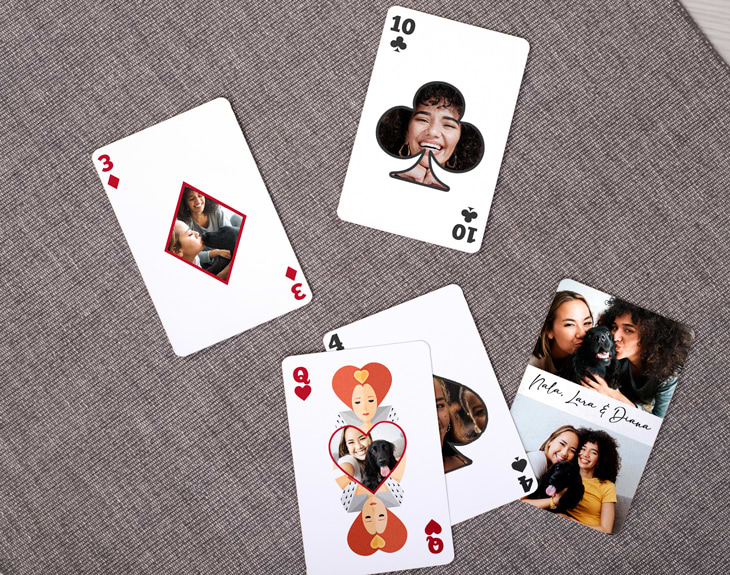 ¿Quieres jugar a las cartas de una forma única a irrepetible? Aquí te traemos esta baraja de Poker personalizada. Por delante, la clásica baraja francesa con picas, corazones, diamantes y tréboles, cada palo personalizado con la foto que tú elijas. Por detrás, un diseño elegante y perfecto para no distraerse en el juego. Además las cartas vienen en una caja de plástico para que puedas protegerlas y llevarlas donde quieras. ¡El regalo perfecto para un amante de los juegos de naipes! Medidas aproximadas de cada carta: 8,6 x 5,7 cm.