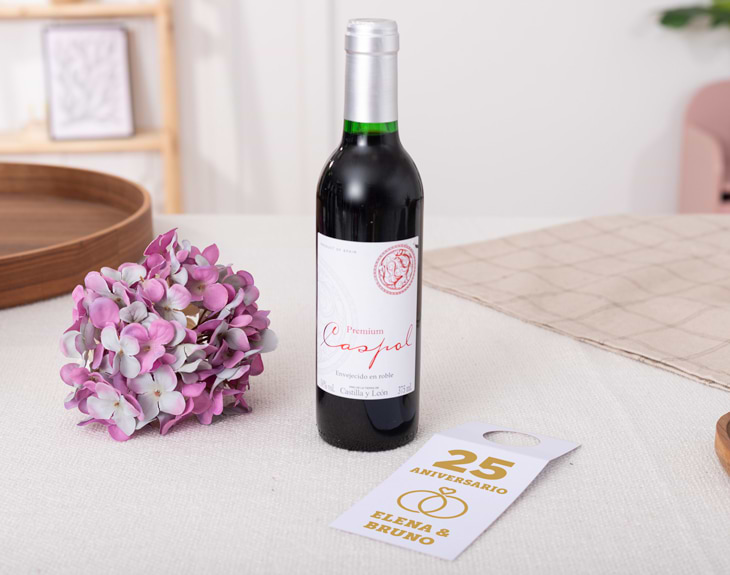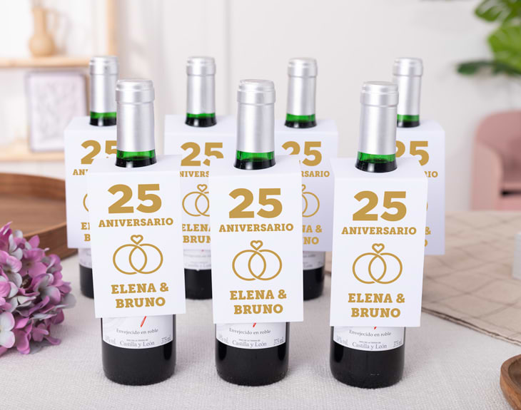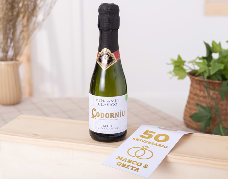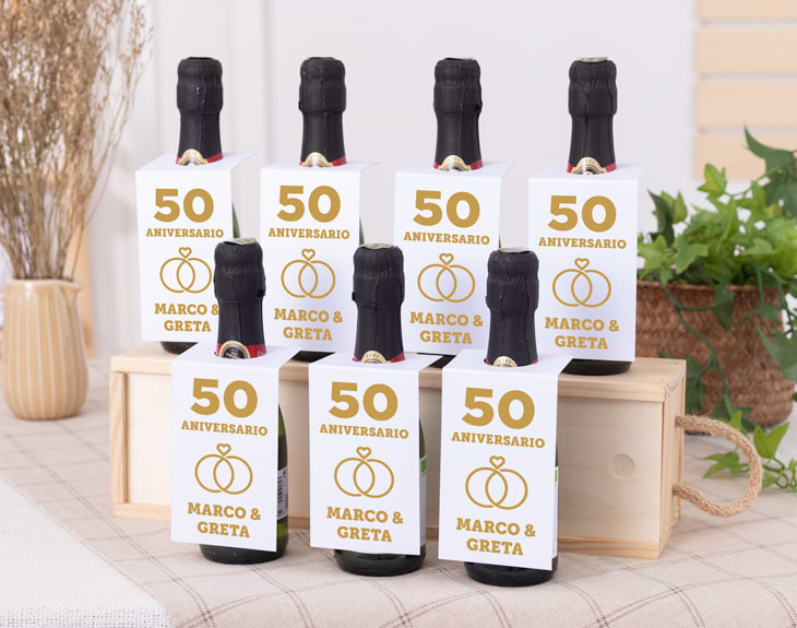 Porque brindar por el amor es una de las cosas más bonitas que existen en la vida, y celebrar un aniversario, ya sea uno, cinco o cincuenta lo hace aún más especial. Por eso, nuestro benjamín de cava o vino con tarjeta personalizada es el detalle perfecto para conmemorar el amor, los sueños compartidos y todos los años que aún están por venir. Estas mini botellitas de cava o vino son un obsequio elegante y encantador para tus invitados o personas más cercanas. Ideales como regalo original para aniversarios, bodas o simplemente como detalle romántico. Sin duda, quedarán maravillados. Su diseño con anillos es sutil, delicado y precioso. Y, cómo no... ¡salud por ese nuevo aniversario! Que vengan muchos más. Personalizar es muy fácil: solo tienes que elegir la bebida que más os apetezca para esa gran celebración, champán, cava o vino ¡lo que más os guste! Después, diseña la tarjeta con vuestro nombre, fecha o un mensaje especial. Quedará genial y será un regalo de aniversario personalizado inolvidable. Gramaje del papel: 300 gr.