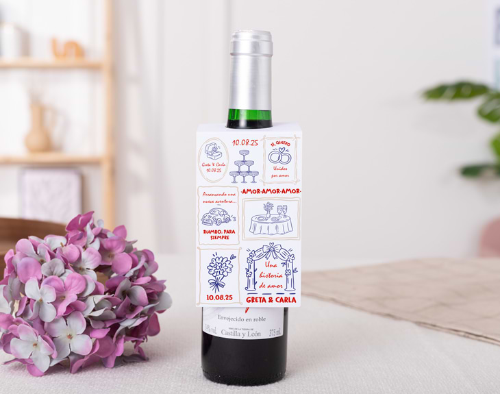 Cada boda es un momento único e inolvidable, y el recuerdo que dejes en tus invitados marcará la diferencia. Si buscas un detalle original y con personalidad para tu gran día, nuestras mini botellas de vino o cava personalizadas con diseño "Dibujos de boda" son la opción perfecta. Estos pequeños benjamines, disponibles en vino o cava, se convierten en recuerdos de boda ideales para sorprender a familiares y amigos. Lo mejor es que son completamente personalizables: podrás añadir vuestros nombres, la fecha y un mensaje especial para hacer que este detalle refleje la magia de vuestra celebración. Personalizar estas mini botellas es muy sencillo. Solo tienes que añadir el producto al carrito y acceder al área de personalización, donde podrás escribir el texto que desees. En poco tiempo tendrás un recuerdo original de boda, para que tus invitados guarden para siempre ese día tan especial.