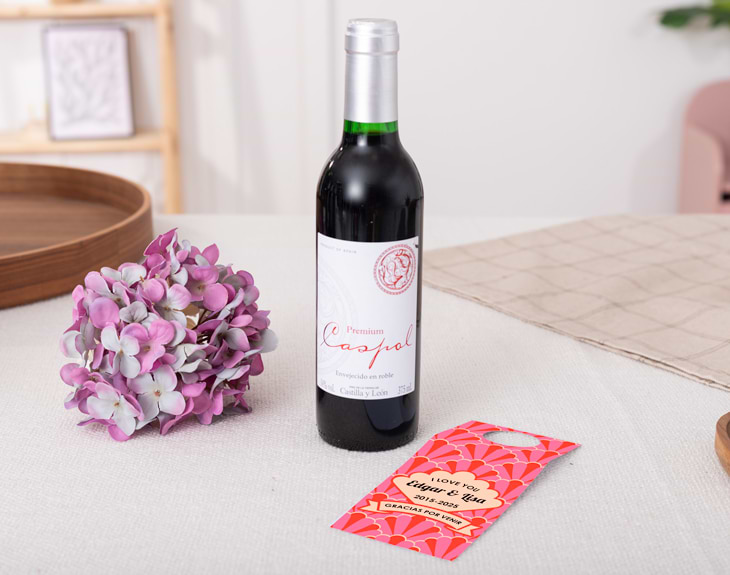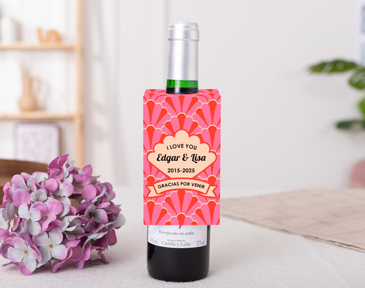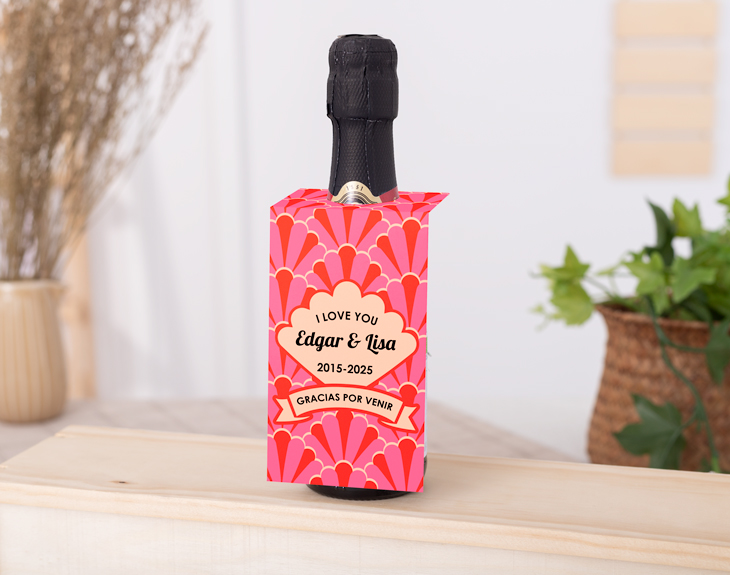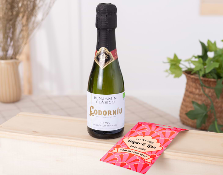 Las celebraciones de boda son momentos en los que el amor lo envuelve todo. Es el día en el que dos almas se unen para compartir una vida juntos y comienza la aventura más bonita en pareja. Amar y ser amados es, sin duda, el regalo más grande.Y hablando de regalos, esta benjamín de cava o vino con tarjeta personalizada es ideal para obsequiar a tus invitados en ese día tan especial. Porque ellos también forman parte de ese amor tan bonito que dice “sí” para toda la eternidad. El diseño I Love You Retro de estas botellitas de cava o vino es tan colorido y divertido que resulta perfecto para una celebración donde el amor es el gran protagonista. ¡Seguro que encantará a todos! Al momento de personalizar, puedes elegir entre dos diseños y seleccionar la bebida que prefieras: cava o vino. Escribe el texto que quieras, vuestros nombres o un mensaje especial... ¡tú decides! Quedará estupenda, lista para convertirse en un regalo de bodas o aniversario como este gran día.