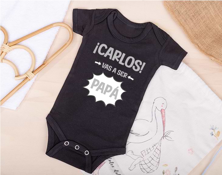 ¿Estás embarazada y el padre del bebé todavía no lo sabe? Continúa leyendo, esto te va a interesar. Este body de bebé es ideal para darle esta buena noticia a modo de sorpresa. Puedes guardarlo en una cajita o envolverlo para que no se sepa lo que es, así cuando lo habrá descubrirá la gran noticia. Sin duda, se llevará una gran sorpresa. Y es que no es para menos porque la llegada de un bebé es increíble, ¡Llenará toda la casa de alegría y emoción! Sin duda, este body “Vas a ser papá” es la mejor prenda para los bebés en sus primeros meses de vida. Existe la posibilidad de elegir el color que más os guste, entre: azul, negro, blanco o rosa. Están fabricados en suave tela de algodón, perfecta para la delicada piel de los más pequeños. Cuentan con cuello tipo americano y con corchetes en la parte inferior para hacer los cambios de ropa o pañal mucho más sencillos. Son de manga corta y están disponibles en tallas desde los 3 meses hasta los 18 meses. Y te preguntarás: ¿cómo personalizar este body tan chulo? El primer paso a seguir es añadir el producto al carrito y entrar al área de personalización. Una vez ahí, podrás escribir el nombre del padre del bebé y nosotros no encargamos de todo lo demás. ¡Pronto quedará listo para sorprender al padre del bebé!
