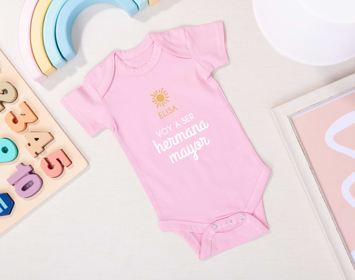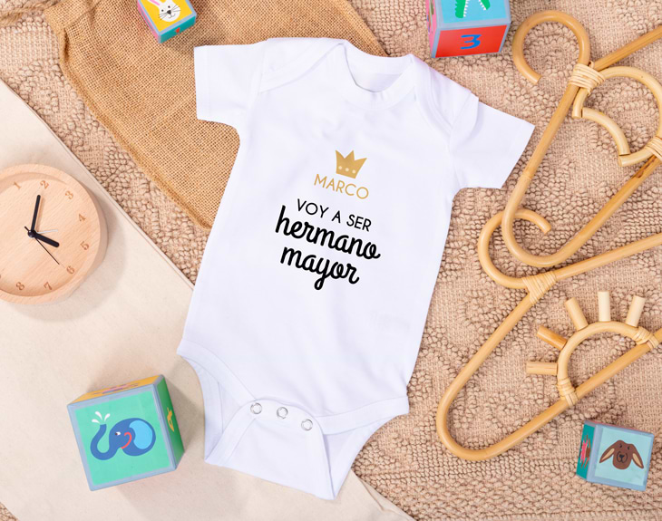 Ser hermano mayor tiene sus ventajas y sus desventajas pero siempre hace muchísima ilusión tener un hermanito pequeño, por eso, si quieres darle una sorpresa a tu hijo con esta gran noticia, tenemos el la manera perfecta. Nuestro body personalizado con diseño "Voy a ser hermano mayor" es ideal para esta ocasión. Lo más guay de este body es que es personalizable, podrás escribir el nombre de tu hijo. ¡Quedará genial! Nuestros bodys están fabricados en suave tela de algodón, perfecta para la delicada piel de los más pequeños. Cuentan con cuello tipo americano y con corchetes en la parte inferior para hacer los cambios de ropa o pañal mucho más sencillos. Son de manga corta y están disponibles en tallas desde los 3 meses hasta los 18 meses. Por último, personalizar este body es súper sencillo. El primer paso a seguir consiste en añadir el producto al carrito y entrar al área de personalización. Una vez ahí, ya puedes escribir el nombre que tú quieras en este body tan chulo. Pronto estará perfecto y listo para regalar. ¡Será un original regalo para nacimientos!