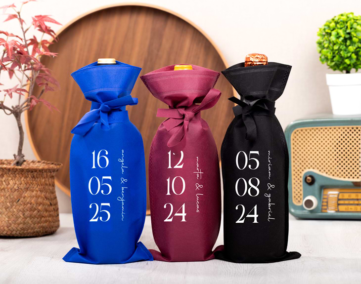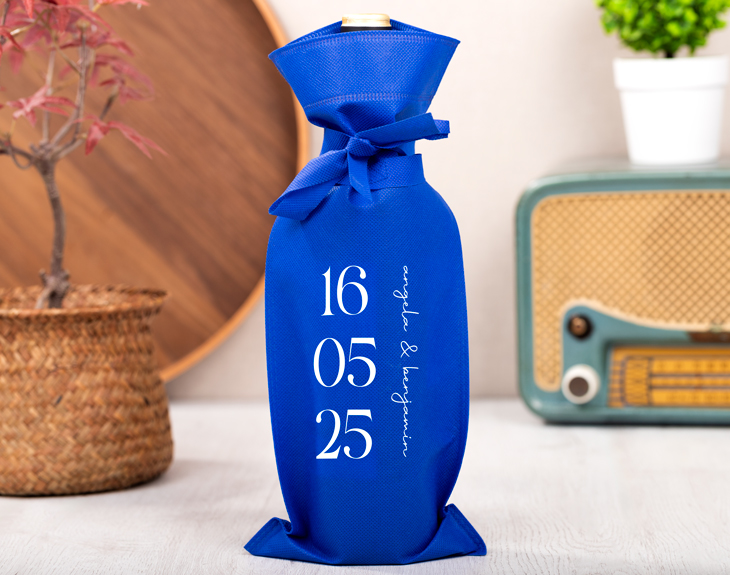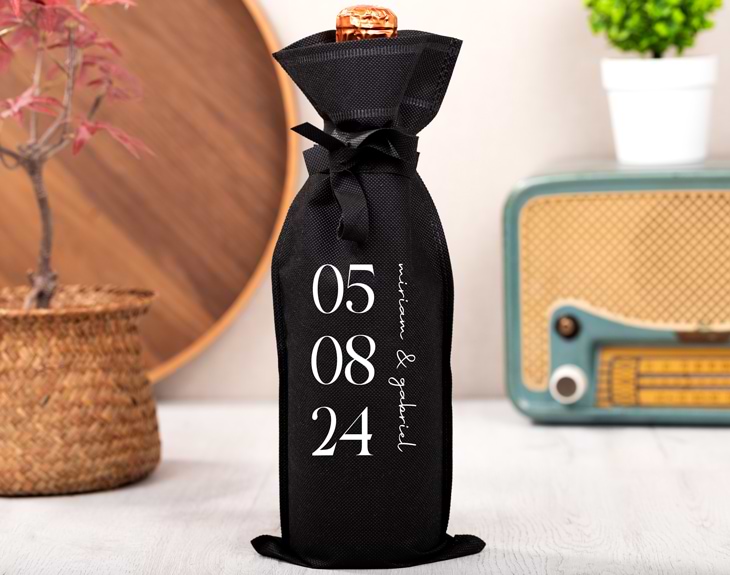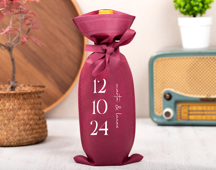 Estáis organizando vuestra boda y ha llegado el momento de pensar un pequeño regalo para todos vuestros invitados. Hay muchísimas opciones, pero seguro que ninguna tan guay como estas bolsas para botellas de vino que podrás personalizar con este precioso y minimalista diseño. Sin duda, es el detalle que necesitáis para la familia y amigos. Deja de buscar porque estas originales bolsitas son todo lo que necesitas para el día más importante de vuestra vida. Podrás elegir el color de la bolsita (azul, negro o burdeos) y una de las dos opciones que te damos: comprar solo las bolsitas o añadirle una botella de vino a todas. ¡Dejarás sin palabras a todos tus invitados con este recuerdo! Llega la hora de personalizar estas bolsas. ¡Es muy sencillo! Elige la opción y también si quieres que todas las bolsitas sean iguales o cada una distinta. Después, en el área de personalización, podrás completar este diseño con el texto que quieras para hacer un regalo único y diferente. Tendrás el mejor recuerdo para esta fecha tan especial.