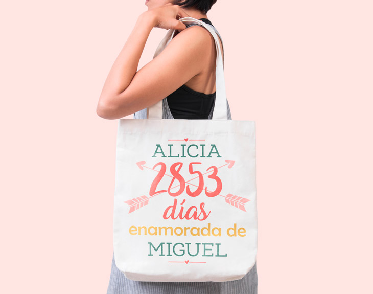 Sorprende a tu pareja inmortalizando los días que lleváis juntos en esta bolsa tote personalizada. El perfecto regalo original para vuestro aniversario o cualquier cita especial donde le recuerdes con nuestro texto que aún sigues enamorado/a de él/ella. Puedes personalizar esta bolsa de tela tanto con vuestros nombres como con el número exacto de días de vuestra relación. Además de un bonito recuerdo, tu pareja podrá llevar esta totebag para ir al gimnasio, a clase, a la biblioteca... ¡Llevando tu amor por todas partes! Sigue cumpliendo días con tus parejas y celebrando momentos juntos con esta bolsa tote celebrando todo el tiempo que ya habéis compartido.
