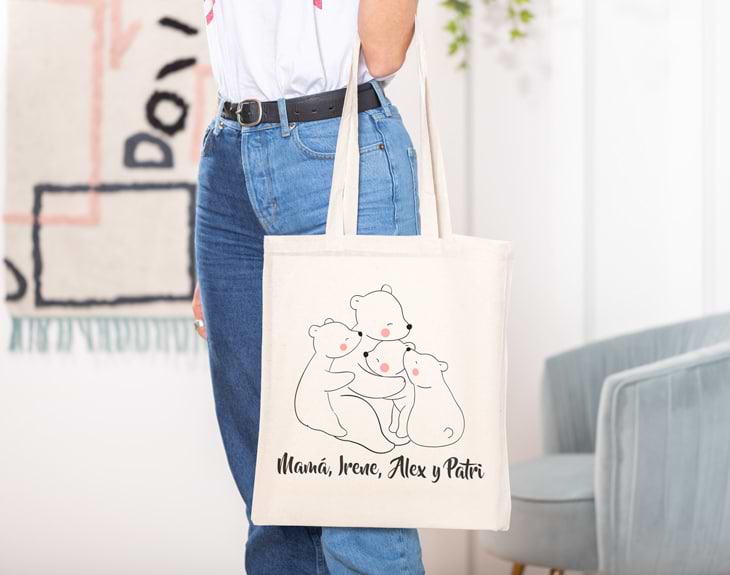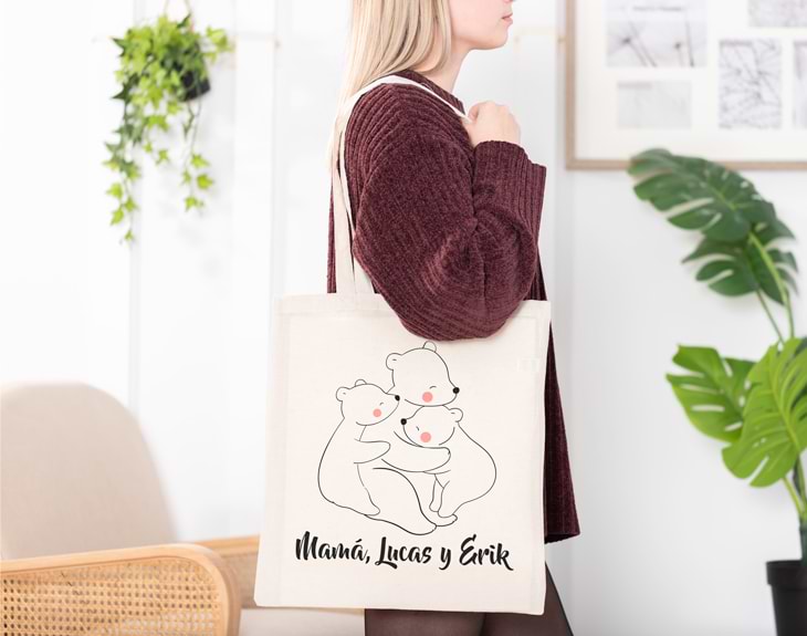 Las madres son maravillosas. Nos apoyan, nos quieren, nos cuidan un montón y siempre están pendientes de todo. ¡Son súper previsoras! Por eso, seguro que tu madre siempre lleva el bolso lleno de cosas para "por si acaso". Si quieres tener un detalle con ella para agradecerle todo lo que hace por la familia, nuestra bolsa tote personalizada con diseño "Mamá osa" es ideal. Ya sea por el Día de la Madre, por su cumpleaños o por ser la mejor mamá del mundo, sorpréndela con este regalo tan original. Es ideal para que pueda guardar todo lo necesario en el día a día. Además, lo mejor es que es personalizable, podrás escribir vuestros nombre en esta bolsa de tela tan adorable. ¡Le encantará! Personalizar esta bolsa tote es muy sencillo. El primer paso a seguir consiste en añadir el producto al carrito y entrar al área de personalización. Una vez ahí, ya puedes escribir lo que tú quieras. Pronto estará perfecta y lista para regalar. ¡Será un original regalo para madres!
