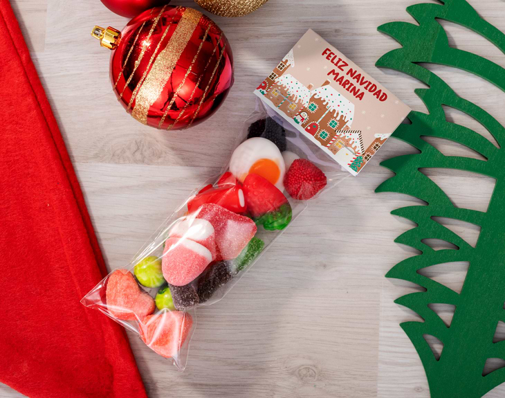 La magia de la Navidad llega a todas partes. En cada rincón del planeta se siente su espíritu y su alegría... y también llega a través de las golosinas. Esta bolsita de chuches personalizada te dará esa dosis de dulzura que necesitas para vivir esta temporada tan especial con más ilusión. Y si eres un gran amante de las chuches, ¡aún más! Es perfecta como regalo dulce de Navidad para alguien especial, ya sea un amigo, un familiar o cualquier persona a la que quieras sorprender. Porque el niño que llevamos dentro adora las golosinas. Además, si estás preparando el cumpleaños de tu hijo/a en estas fechas, es ideal como detalle de fiesta infantil: podrás escribir el nombre del cumpleañero con su edad o el nombre de cada uno de los amiguitos. Combinado con su diseño de casitas de jengibre, crea la dupla perfecta entre dulzura y Navidad. Personalizar esta dulce sorpresa navideña es muy fácil. Solo tienes que añadirla al carrito y, en el área de diseño, escribir el texto que quieras o una frase corta. Así tendrás un regalo original navideño y podrás disfrutar de la Navidad con ese toque dulce que todos amamos. Medidas: 22 x 7,5 centímetros. Peso: 125 gr.