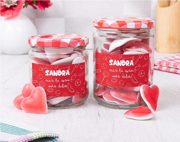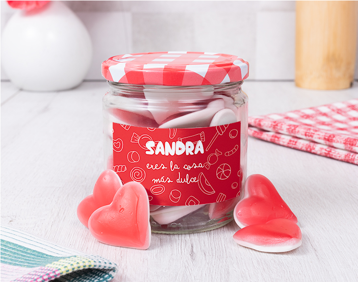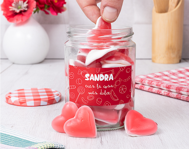 El amor se celebra todos los días, eso está claro, pero siempre hay fechas especiales en las que nos gusta sorprender a nuestra pareja y demostrarle cuánto le queremos. Un 14 de febrero, un aniversario, una fecha especial para vosotros... ¡este bote de chuches personalizado es el regalo perfecto! Con este bote tan dulce lleno de chuches, sorprenderás a tu pareja en cualquier fecha especial para vosotros. Es un regalo único e ideal para las personas más golosas. Este bote trae un mensaje de lo más especial, para decirle a esa persona que es la cosa más dulce del mundo. Cualquier día del año es bueno para celebrar el amor y la amistad, y no hay mejor manera de hacerlo que con este original y delicioso bote de chuches. Este regalo está pensado para sorprender a esa persona tan especial y regalar algo que no sea lo típico que regalamos en fechas como San Valentín o un aniversario. ¡Le encantará este regalo! Además, el contenido del bote es surtido. Pero si quieres que este regalo sea único y muy personal, podrás personalizar este bote añadiendo el nombre de la persona que tú quieras. ¡Es muy sencillo! Añade el producto al carrito, entra en al apartado de personalizar y añade el nombre en este diseño. Podrás ver directamente cómo queda y visualizar el nombre y la frase juntos. ¡Abre este bote y disfruta de su dulce interior! Bote grande: Altura: 11 cm. Diámetro: 8 cm. Bote pequeño: Altura: 8,5 cm. Diámetro: 8 cm. Importante: si puedes tener reacción a cualquier tipo de alérgenos, puedes escribirnos para consultar si hay alguna opción alternativa. Importante: El tipo de chuches es surtido, puede variar según stock.
