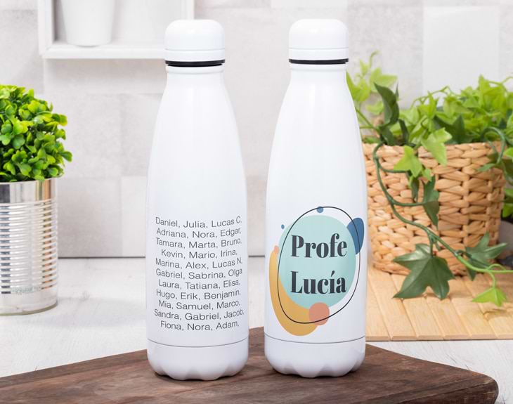 Beber agua es imprescindible para nuestro día a día y más para los profes que se pasan toda la mañana hablando mientras dan clase. Por eso, si en fin de curso queréis hacerle un regalo de despedida, tenemos el mejor detalle. ¡Nuestra botella nature personalizada con diseño "Nos haces brillar" es ideal para una ocasión como esta! Y es que esos profes que consiguen sacar todo lo bueno de sus alumnos, se merecen todo lo bueno de este mundo. Nuestra botella nature es una forma de demostrarle lo mucho que que lo apreciáis y todo lo que habéis disfrutado durante sus clases. Además, lo mejor que tiene es que es personalizable, podrás escribir el nombre de ese profe tan guay. ¡Le encantará! Personalizar esta botella nature es muy sencillo. El primer paso a seguir consiste en añadir el producto al carrito y entrar al área de personalización. Una vez ahí, ya puedes escribir el nombre de la mejor profe del mundo. Pronto estará perfecta y lista para regalar. ¡Será un original regalo de profesores! Altura de la botella: 25,5 cm. Diámetro de la base de la botella: 6 cm. Capacidad: 500 ml. Material: Acero inoxidable de doble pared.