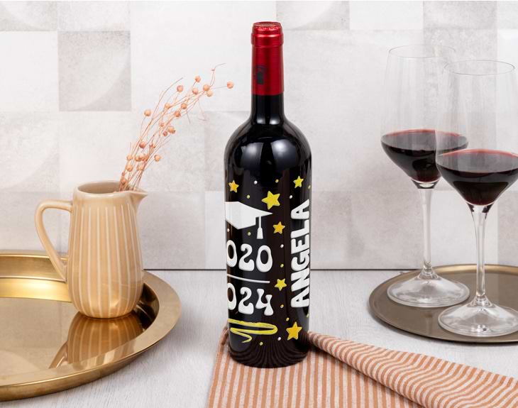 No hay emoción comparable a la de terminar, por fin, esa carrera o curso en el que has estado trabajando durante tanto tiempo. Por eso, esta graduación merece una celebración especial en la que no falte de nada, incluida esta botella de vino personalizada con diseño de graduación con la que brindar por tu gran logro. ¡Enhorabuena! Y si tienes cerca a alguien que acaba de graduarse y es amante del buen vino, esta es la ocasión perfecta para hacerle un detalle para graduación único, personalizado y original. Además, este producto tiene un diseño tan especial que lo convierte en el regalo original ideal. Seguro que será la envidia de todos en la celebración. ¡Corre, añádelo al carrito y prepárate para brindar! Personalizar es muy fácil: en el diseño, escribe el nombre, las fechas o el texto que prefieras, y prepárate para brindar y celebrar con esta botella de vino para graduación como se merece. Utilizamos como base un exquisito vino de la Tierra de Castilla y León, cuya certificación de origen garantiza una calidad excepcional. Envejecido en barrica de roble, es un caldo sorprendente y lleno de matices. Su botella premium y su sabor cuidadosamente elaborado lo convierten en el mejor regalo posible.