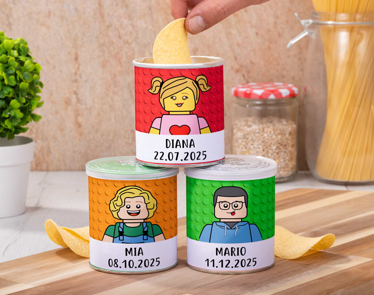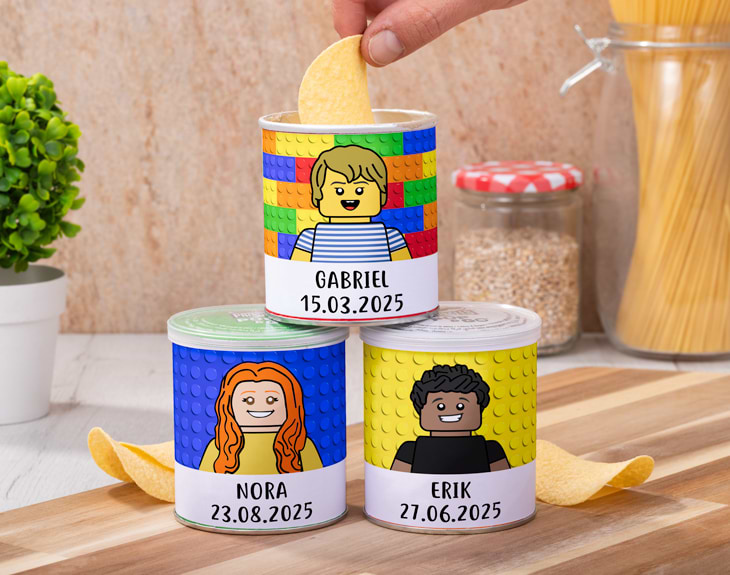 ¿Te imaginas poder juntar tus patatas fritas favoritas con esos muñecos con los que jugabas de pequeño? ¡Pues nosotros lo hemos hecho! Y como era de esperar, ha salido la mejor combianación del mundo: ¡nuestros botes de Pringles personalizados con personajes Lego! Sí sí, has leído bien. Vas a poder hacerte con estos divertidos y únicos botes de Pringles para regalar en cualquier momento y sorprender a quien tú quieras. ¡Es lo más! Con este original regalo ya no tienes excusa para triunfar en un cumpleaños, una fiesta o el amigo invisible. Vas a poder elegir qué sabor quieres (Original, Sour Cream & Onion o Paprika) y también cómo quieres personalizarlo. Deja volar tu imaginación y ponte a crear tu propio Lego para tener un bote de Pringles único. ¡No hay mejor manera de disfrutar de estas patatas! Para personalizar estos 3 botes de Pringles, añádelos al carrito y entra en el área de personalización. El primer paso es elegir qué fondo de bloques de colores te gusta más. Después, ya podrás comenzar a crear tu personaje Lego con todos los detalles que quieras y el paso final es añadir un texto, el que tú quieras. Recuerda que podrás personalizar uno a uno los botes de patatas, así será mucho más sencillo. Sabores disponibles: Original, Sour Cream & Onion y Paprika.