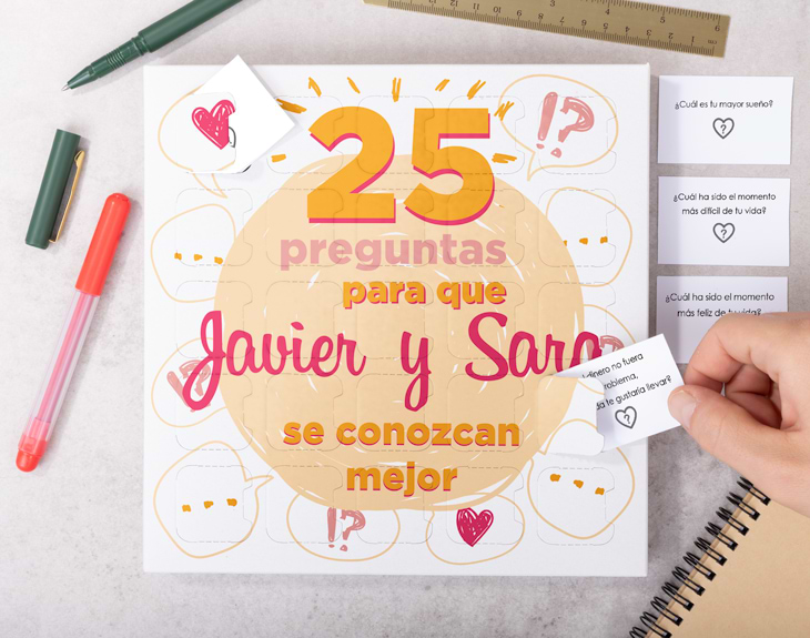 Si buscas experiencias nuevas con tu pareja, esta caja de sorpresas personalizada es perfecta para que os lo paséis genial. Se trata de una caja que esconde 25 preguntas para que tu pareja y tú os las preguntéis cada día. 25 días llenos de preguntas interesantes para que conozcas mejor a la persona con la que vas a compartir la vida. Os encontraréis con preguntas como "¿Cuál es tu mayor miedo?" o "¿Cómo definirías el amor?". Además, si sois una pareja súper divertida, os encantarán las preguntas como "Si fueras un animal, ¿cuál serías?". ¡Es un juego divertidísimo para las mejores parejas! Solo necesitamos vuestros nombres para personalizar la caja. No conocerás las preguntas hasta que abras día a día cada ventanita. ¡Es un juego súper íntimo y romántico! Ideal para pasar más tiempo con tu pareja, conoceros mucho y disfrutar de vuestro amor. Si tu relación es como un amor de cuento, esta caja es el regalo perfecto para San Valentín, su cumpleaños, vuestro aniversario o un día que te apetezca sorprenderle porque sí. Medidas aproximadas de la caja: 23 cm x 23 cm.