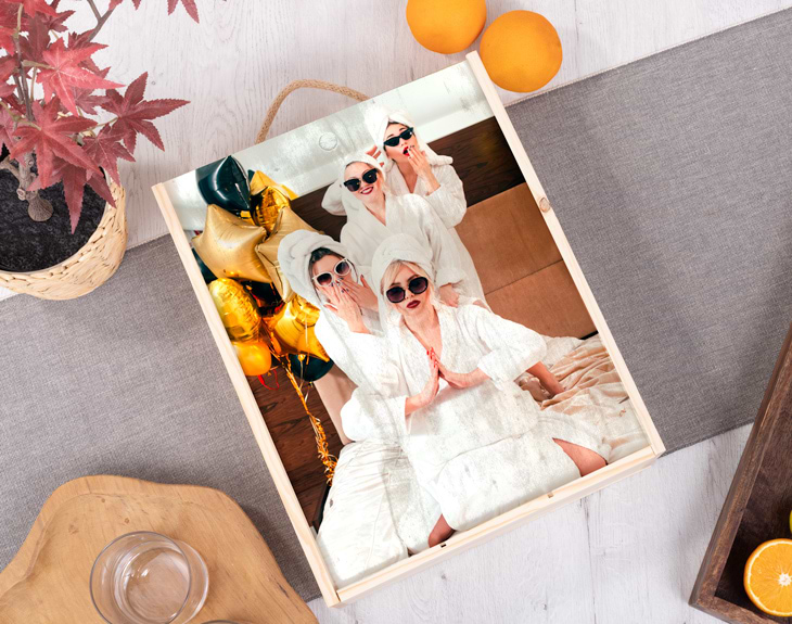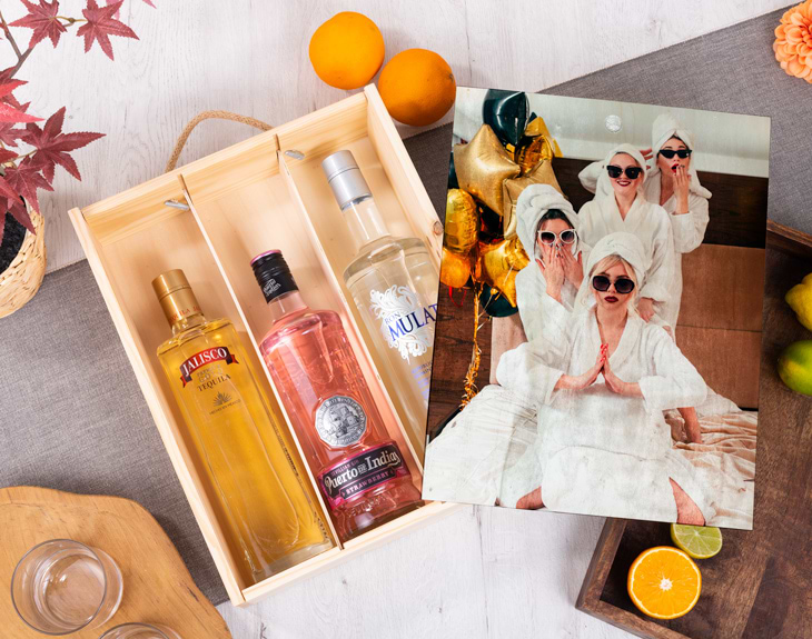 Cuando llega cualquier tipo de celebración, siempre se nos viene la misma pregunta: ¿qué podemos regalarle a los afortunados? Ya sea en un cumpleaños, una boda o cualquier otro tipo de fiesta, siempre tienes que hacerle un regalo a esas personas que están de celebración. ¡Y no es una tarea nada fácil! Conseguir un regalo que haga ilusión a todos puede llegas a ser complicadísimo. Por eso hay que pensar en algo que emocione a todos. ¿Y qué no puede faltar en una fiesta? Una copilla de vez en cuando (y con precaución) nunca está de más. Por ello tenemos una selección de los mejores alcoholes en esta caja para vinos personalizada. ¡Una fiesta perfecta! Esta caja de madera con surtido de tres botellas con foto cuenta con unas medidas de 29 centímetros de largo por 37 centímetros de alto. El ancho tiene una medida de 10 centímetros, y en su interior encontrarás tres botellas de diferentes alcoholes variados: una de tequila, otra de ron blanco, y otra de ginebra. ¿Qué tienes que hacer para personalizar este regalo original? Una vez añadido el producto al carrito, solo tendrás que entrar en el área de personalización. Ahí podrás añadir la imagen que quieras a nuestro sistema, para después incluirla en la plantilla de la caja. ¡Quedará un regalo espectacular! Importante: la caja de madera trae de serie un pequeño círculo superior centrado para abrir la caja donde recomendamos no diseñar cosas importantes de la personalización.