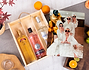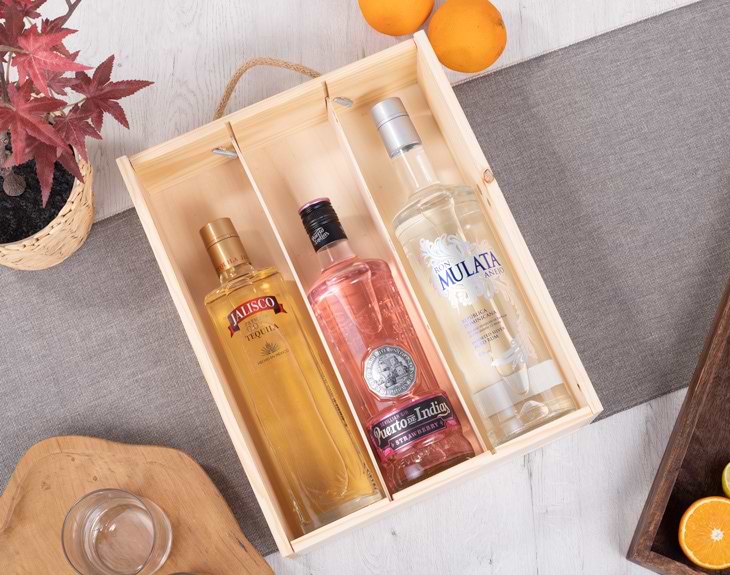 • Caja de madera personalizada. • 3 Botellas de alcohol (surtido): - Tequila Jalisco 70 cl. - Ron añejo Mulata 100 cl. - Ginebra Puerto de Indias 70 cl. • Tarjeta Recordatoria. IMPORTANTE: Prohibida la venta de bebidas alcohólicas a menores de 18 años.