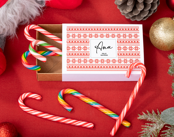 ¡La Navidad está para vivirla y disfrutarla! Es la mejor época para estar con la familia y vivir en un ambiente de felicidad y amor constante. Las comidas familiares, los regalos, las sorpresas, las luces navideñas… ¡Todo hace que sean siempre unas fechas inolvidables! Pero, si lo que más te gusta de estas fechas son los dulces navideños… ¡Tenemos algo que no te puede faltar! Se trata de nuestra caja con bastones de caramelo, un dulce de lo más navideño. Incluye 5 bastones de caramelo. Que podrás colgarlos en árbol o comértelos. ¿Lo mejor? Que la caja es personalizable. ¡Podrás escribir lo que tú quieras! Personalizar esta caja de bastones de caramelo es súper sencillo. El primer paso a seguir consiste en añadir el producto al carrito y entrar al área de personalización. Una vez ahí, escribes el nombre o la felicitación navideña que tú quieras. Pronto quedará perfecta y lista para regalar. ¡Será un original regalo navideño! Incluye 5 bastones de caramelo. Medidas caja: 10 cm x 15,5 cm.