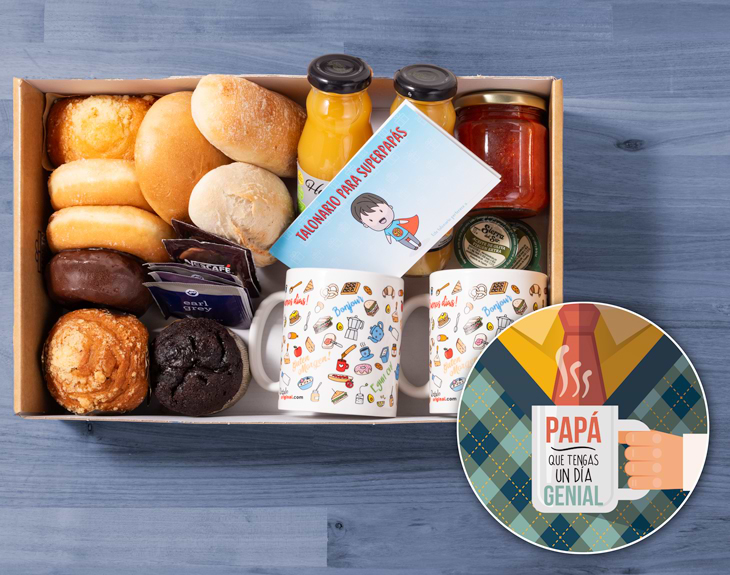 Contenido para 1 persona: • Caja. • Taza blanca (personalízala por 5€). • Manzana roja (opcional) • Café. • Té de varios sabores. • Zumo ecológico. • Bollería Artesanal: -Coulant de chocolate (artesanal). -Muffins con pepitas. (artesanal). -Donuts. -Mini Donuts. • Talonario con vales para súper papás. • Servilleta. • Tarjeta Recordatoria. Contenido para 2 personas: • Caja. • 2 Tazas blancas (personaliza cada una por 5€). • 2 Cafés. • Té de varios sabores. • 2 Zumos ecológico (Huerto de Sabor). • Bollería Artesanal: -Coulant de chocolate (artesanal). -Muffins con pepitas. (artesanal). -Donuts. -Mini Donuts. • Panes artesanales: - Pan chapata - Pan de cristal. - Pan brioche. • Tomate rosa de Barbastro triturado (300g). • 2 Aceites de oliva ecológicos 10 ml. • 2 cuberterías. • 2 servilletas. • Talonario con vales para súper papás. • Tarjeta Recordatoria. Las tazas y los termos personalizados reemplazarán a los del desayuno. ¿Cómo incluir los productos opcionales? Una vez hayas seleccionado el tipo de desayuno, en el apartado de adicionales (paso 2) podrás añadir todos los productos opcionales que quieras.