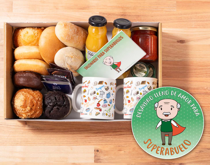 Contenido para 1 persona: • Caja. • Taza blanca (personalízala por 5€). • Manzana roja (opcional). • Café. • Té de varios sabores. • Zumo ecológico. • Bollería Artesanal: -Coulant de chocolate (artesanal). -Muffins con pepitas. (artesanal). -Donuts. -Mini Donuts. • Talonario con vales para súper abuelos. • Servilleta. • Tarjeta Recordatoria. Contenido para 2 personas: • Caja (personalizada o sin personalizar). • 2 Tazas blancas (personaliza cada una por 5€). • 2 Cafés. • Té de varios sabores. • 2 Zumos ecológicos. • Bollería Artesanal: -Coulant de chocolate (artesanal). -Muffins con pepitas. (artesanal). -Donuts. -Mini Donuts. • Panes artesanales: - Pan chapata - Pan de cristal. - Pan brioche. • Tomate rosa de Barbastro triturado (300g). • 2 Aceites de oliva ecológicos 10 ml. • 2 cuberterías. • 2 servilletas. • Talonario con vales para súper abuelos. • Tarjeta Recordatoria. Las tazas y los termos personalizados reemplazarán a los del desayuno. ¿Cómo incluir los productos opcionales? Una vez hayas seleccionado el tipo de desayuno, en el apartado de adicionales (paso 2) podrás añadir todos los productos opcionales que quieras.