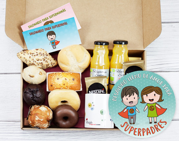 Contenido para 2 personas: • Caja (personalizada o sin personalizar). • 2 Taza blancas (personalízalas por 5€ cada una). • 2 Cafés. • Té de varios sabores. • 2 Zumos ecológicos. • Bollería Artesanal: -Coulant de chocolate (artesanal). -Muffins con pepitas. (artesanal). -Donuts (Pan Rico). -Mini Donuts (Pan Rico). • Panes artesanales: - Pan chapata - Pan de cristal. - Pan brioche. • Tomate rosa de Barbastro triturado (300g). • 2 Aceites de oliva ecológicos 10 ml. • 2 cuberterías. • 2 servilletas. • Talonario con vales para súper papás. • Talonario con vales para súper mamás. • Tarjeta Recordatoria. Este desayuno solo está disponible para dos personas. Las tazas y los termos personalizados reemplazarán a los del desayuno. ¿Cómo incluir los productos opcionales? Una vez hayas seleccionado el tipo de desayuno, en el apartado de adicionales (paso 2) podrás añadir todos los productos opcionales que quieras.