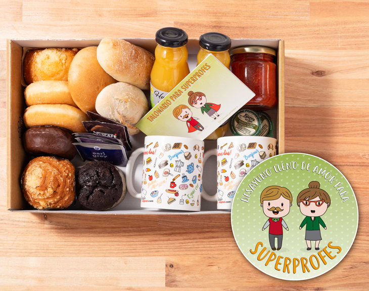 Contenido para 1 persona: • Caja. • Taza blanca (personalízala por 5€). • Manzana roja. • Café. • Té de varios sabores. • Zumo ecológico (Huerto de Sabor). • Bollería Artesanal: -Coulant de chocolate (artesanal). -Muffins con pepitas. (artesanal). -Donuts. -Mini Donuts. • Talonario con vales para súper profes. • Servilleta. • Tarjeta Recordatoria. Contenido para 2 personas: • Caja (personalizada o sin personalizar). • 2 Tazas blancas (personaliza cada una por 5€). • 2 Cafés. • Té de varios sabores. • 2 Zumos ecológico (Huerto de Sabor). • Bollería Artesanal: -Coulant de chocolate (artesanal). -Muffins con pepitas. (artesanal). -Donuts. -Mini Donuts. • Panes artesanales: - Pan chapata - Pan de cristal. - Pan brioche. • Tomate rosa de Barbastro triturado (300g). • 2 Aceites de oliva ecológicos 10 ml. • 2 cuberterías. • 2 servilletas. • Talonario con vales para súper profes. • Tarjeta Recordatoria. Las tazas y los termos personalizados reemplazarán a los del desayuno. ¿Cómo incluir los productos opcionales? Una vez hayas seleccionado el tipo de desayuno, en el apartado de adicionales (paso 2) podrás añadir todos los productos opcionales que quieras.