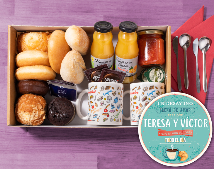 Contenido para 1 persona: • Caja (personalizada o sin personalizar). • Taza blanca (personalízala por 5€). • Manzana roja. (opcional) • Café. • Té de varios sabores. • Zumo ecológico. • Bollería Artesanal: -Coulant de chocolate (artesanal). -Muffins con pepitas. (artesanal). -Donuts. -Mini Donuts. • Servilleta. • Tarjeta Recordatoria. Contenido para 2 personas: • Caja (personalizada o sin personalizar). • 2 Tazas blancas (personaliza cada una por 5€). • 2 Cafés. • Té de varios sabores. • 2 Zumos ecológico (Huerto de Sabor). • Bollería Artesanal: -Coulant de chocolate (artesanal). -Muffins con pepitas. (artesanal). -Donuts. -Mini Donuts. • Panes artesanales: - Pan chapata - Pan de cristal. - Pan brioche. • Tomate rosa de Barbastro triturado (300g). • 2 Aceites de oliva ecológicos 10 ml. • 2 cuberterías. • 2 servilletas. • Tarjeta Recordatoria. Las tazas y los termos personalizados reemplazarán a los del desayuno. ¿Cómo incluir los productos opcionales? Una vez hayas seleccionado el tipo de desayuno, en el apartado de adicionales (paso 2) podrás añadir todos los productos opcionales que quieras.