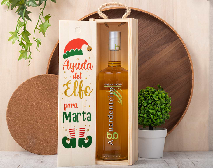 Llega la época del año en la que toca juntarnos con nuestro seres queridos y celebrar el amor y la amistad: ¡la Navidad! No hay nada como terminar cualquier celebración brindando con una copa de vuestro licor favorito. Por eso, el mejor regalo para estas navidades es nuestra caja con botella personalizada. Con un diseño de lo más navideño y una botella en su interior, será genial para brindar en las comidas y cenas de estas fiestas. Este original regalo es perfecto para sorprender a los anfitriones por excelencia de cada Navidad. La caja está hecha de madera y cuenta con unas medidas de 37,5 centímetros de alto por 10,4 centímetros de ancho. Al deslizar la tapa encontraras en su interior el licor que quieras, a elegir entre un montón de opciones. ¡Es lo más! Pero antes de disfrutar de este regalo tendrás que personalizar la caja de madera. En el desplegable de la derecha encontrarás las diferentes opciones de licores que tenemos. Escoge la que más te guste para poder entrar en el área de personalización. ¡Después solo tendrás que personalizar este elfo navideño con el texto que quieras! Medidas de la caja: 37,5 cm X 10,4 cm X 11 cm.