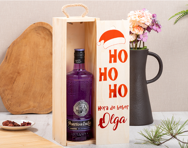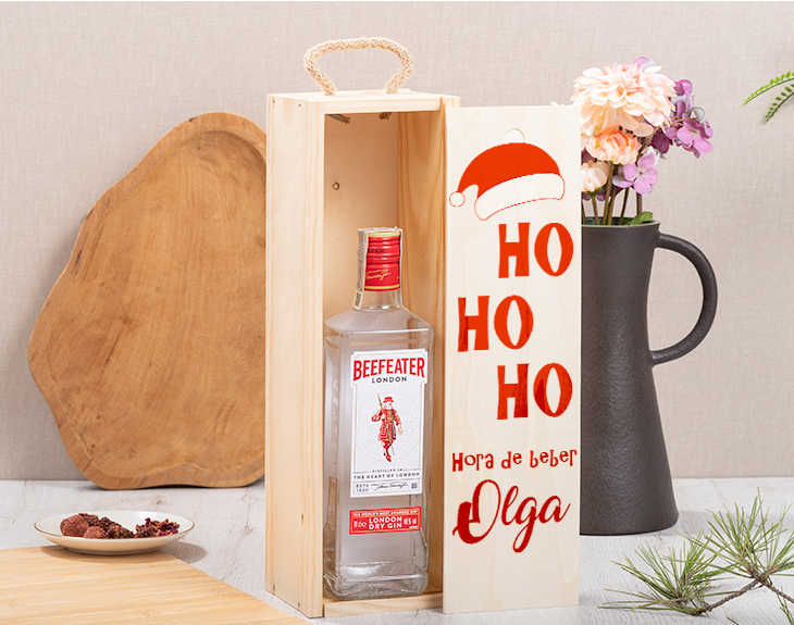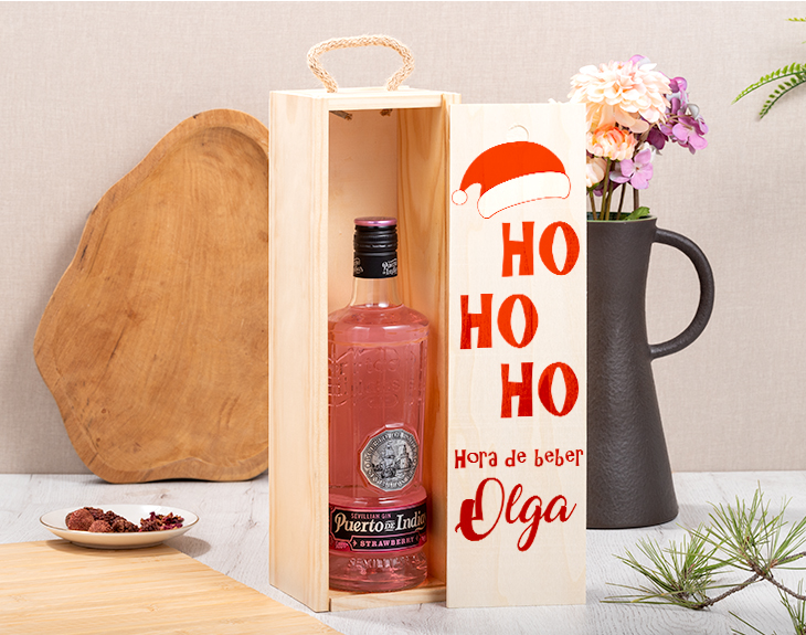 Está claro que la Navidad está hecha para disfrutarla en familia. Esa época tan mágica llena de comidas familiares, fiesta y dulces navideños. Si hay algo que no puede faltar en las celebraciones, es un buen gin tonic. Y es que después de una buena cena siempre hay sitio para unas copitas. Por eso, nuestra caja de madera con ginebra es ideal para festejar estas fechas. Es un regalo muy original para los anfitriones de tus cenas navideñas, podrás sorprenderles con esta caja de madera con ginebra tan chula. La caja está hecha de madera y cuenta con unas medidas de 37,5 centímetros de alto por 10,4 centímetros de ancho. Al deslizar la tapa encontraras en su interior la ginebra que quieras, a elegir entre las siguientes opciones: Tanqueray, Larios Rose, Beefeater o Puerto de Indias (de mora o fresa). Y lo único que faltaría es personalizar esta caja con ginebra. ¡Es súper sencillo! El primer paso a seguir consiste en añadir el producto al carrito y entrar al área de personalización. Una vez ahí, escoges la botella de tu ginebra de confianza y ya puedes escribir el nombre que tú quieras. Nosotros nos encargamos de todo lo demás. Pronto quedará perfecta y lista para regalar. ¡Será un original regalo navideño para anfitriones! Medidas de la caja: 37,5 cm X 10,4 cm X 11 cm.