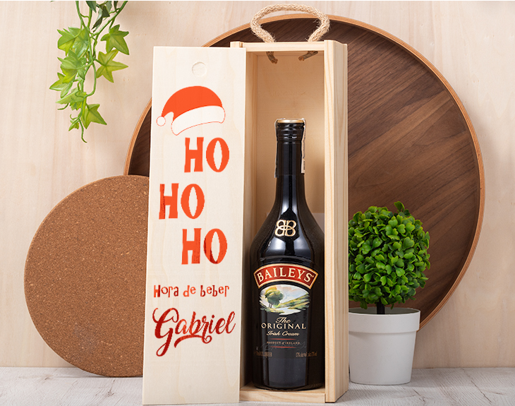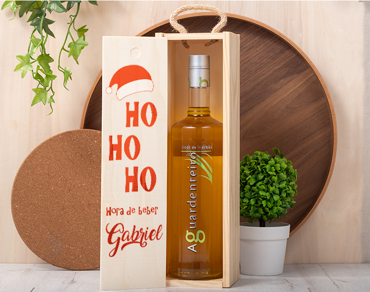 La Navidad es la época perfecta para disfrutarla rodeado de nuestra familia y amigos. Entre tanta celebración y tantas comidas y cenas, si hay algo que no puede faltar es una copa de vuestro licor favorito para brindar. Regala nuestra caja con botella personalizada estas fiestas para sorprender a esa persona tan especial con un detalle único y muy diferente. ¡Triunfarás en cualquier ocasión! Este original regalo será ideal para sorprender a esa persona que siempre celebra las cenas navideñas en su casa y os hace la comida más rica del mundo. Seguro que se queda sin palabras cuando reciba su botella de licor favorita de una manera muy especial. La caja está hecha de madera y cuenta con unas medidas de 37,5 centímetros de alto por 10,4 centímetros de ancho. Al deslizar la tapa encontraras en su interior el licor que quieras, a elegir entre un montón de opciones. ¡Es lo más! Para terminar este regalo te toca personalizar la caja de madera. En el desplegable de la derecha encontrarás las diferentes opciones de licores que tenemos. Escoge la que más te guste para poder entrar en el área de personalización. ¡Después solo tendrás que personalizar este diseño tan navideño con el texto que quieras! Medidas de la caja: 37,5 cm X 10,4 cm X 11 cm.