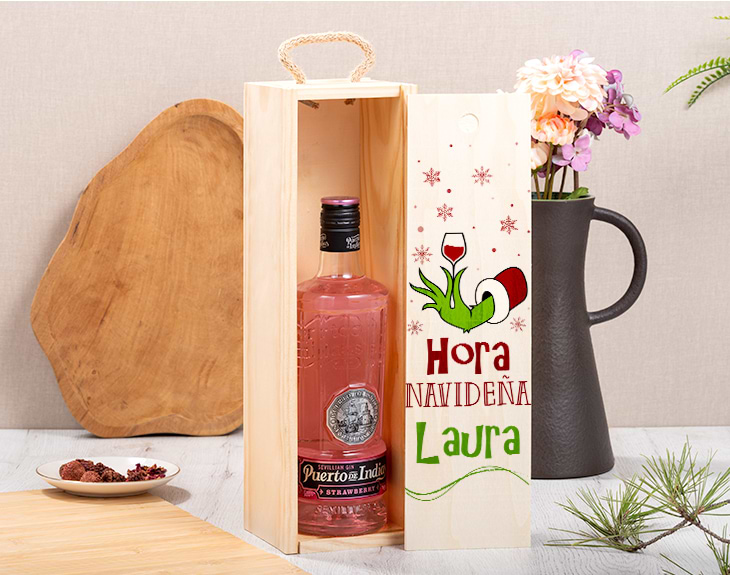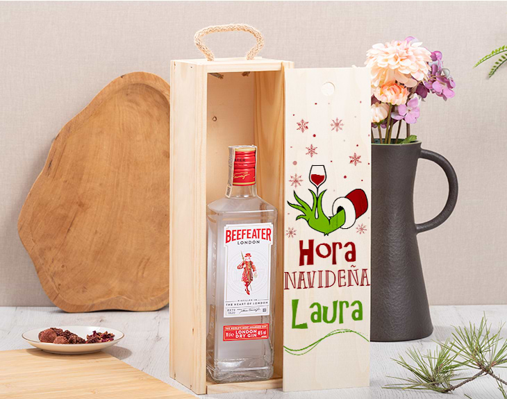 No hay nada mejor para esas celebraciones navideñas que una copa de tu bebida favorita. ¿Estamos todos de acuerdo en que el gin tonic es lo más? ¡Esta es tu oportunidad de celebrar las fiestas de la forma más especial gracias a esta caja con ginebra personalizada! Si conoces a alguien que es como un Grinch pero le encanta saborear un buen gin tonic, no habrá nada como esta caja con botella de ginebra en su interior. Nadie se puede resistir a una buena copa de ginebra repleta de hielos, sobre todo en esas madrugadas de Navidad en los que estás con la familia o tus amigos. ¡Esta caja de madera con diseño de foto y botella de ginebra es el regalo perfecto para sorprender en estas fiestas! La caja está hecha de madera y cuenta con unas medidas de 37,5 centímetros de alto por 10,4 centímetros de ancho, con una profundidad de 11 centímetros. Al deslizar la tapa encontrará en su interior la ginebra que quieras, a elegir entre las siguientes opciones: Tanqueray, Larios Rose, Beefeater o Puerto de Indias (de mora o de fresa). Si a tu Grinch favorito le encanta degustar de una copa de gin tonic en estas fechas tan señaladas, seguro que este regalo original le hará las navidades. En el desplegable de la derecha encontrarás las diferentes opciones de ginebras que tenemos. Escoge la que más te guste para entrar en el área de personalización. ¡Después solo tendrás que personalizar el diseño con el texto que quieras! Medidas de la caja: 37,5 cm X 10,4 cm X 11 cm.