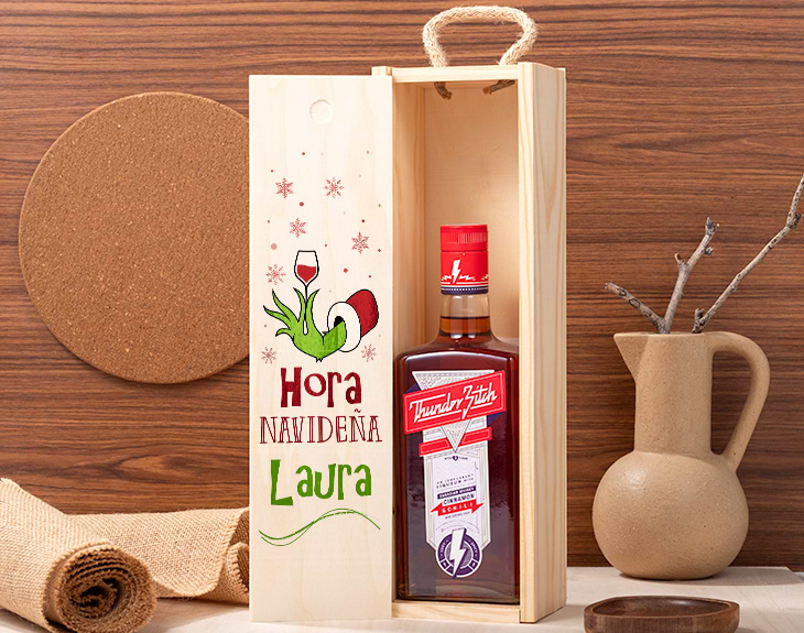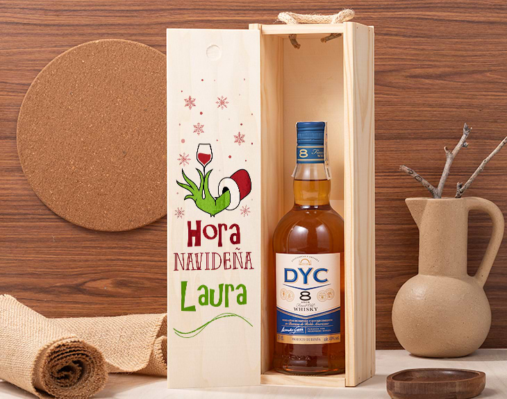 Está claro que las navidades están hechas para disfrutar al máximo con nuestros seres queridos. ¿Por qué no hacerlo de una forma especial regalando una caja con whisky personalizada como esta? ¡Una botella guardada en una caja de madera con un diseño hecho para los más "Grinch" de la casa! Si conoces a una persona que siempre ha odiado estas fechas tan señaladas, no se nos ocurre un mejor regalo que esta caja de madera con diseño de foto y botella de whisky. La caja está hecha de madera y cuenta con unas medidas de 37,5 centímetros de alto por 10,4 de ancho. ¡En su interior podrá encontrar su botella de whisky favorita! Contamos con tres opciones disponibles: DYC, Jack Daniels o Thunder Bitch. ¡Podrás escoger la botella que quieras! Todos conocemos a alguien que siempre se ha sentido identificado con el Grinch en estas fechas. ¡Este regalo original de Navidad es para ellos! Seguro que harás que sus fiestas sean mucho más divertidas. Escoge la botella que quieras entre las opciones disponibles y entra en el área de personalización, donde encontrarás la plantilla del producto. ¡Personaliza este diseño con el nombre que quieras! Medidas de la caja: 37,5 cm X 10,4 cm X 11 cm.