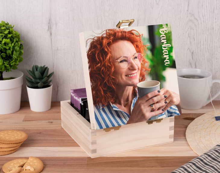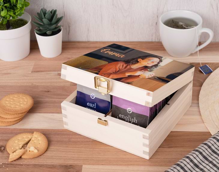 ¿A quién no le va a apetecer un té calentito con la llegada del invierno? Si tienes un amigo o familiar al que le flipa sentarse en el sofá a ver la vida pasar con una taza bien calentita en las manos, esta caja de madera personalizada le vendrá genial. ¡Una caja con espacios para guardar vuestros tés favoritos! Té verde, blanco, matcha, negro... ¡A los amantes de esta bebida tan relajante seguro que les apasionará esta caja de madera para tés con foto! Esta caja cuenta con unas medidas de 16 centímetros en cada uno de sus lados y 8 centímetros de alto, lo que hace que sea perfecta para guardarla en cualquier rincón de vuestro hogar. Cada compartimento cuenta con unas medidas de 7 centímetros... ¡Es perfecto para los sobrecitos de té! ¿Qué es lo único que le falta a este regalo original para ser completamente sorprendente? ¡Vuestra foto favorita podrá decorar este detallazo! Una vez añadas el producto al carrito podrás acceder al área de personalización, donde podrás subir la imagen que quieras al sistema. ¡Ahí podrás ajustarla a la plantilla y crear vuestro propio diseño! Medidas de la caja: 16 x 16 x 8 cm. (Largo x Ancho x Altura) Medidas de cada compartimento: 7 x 7 cm. Importante: La caja no incluye tés. Importante: Las maderas tienen vetas y estas quedan reflejadas en la imagen.