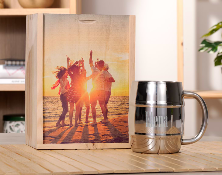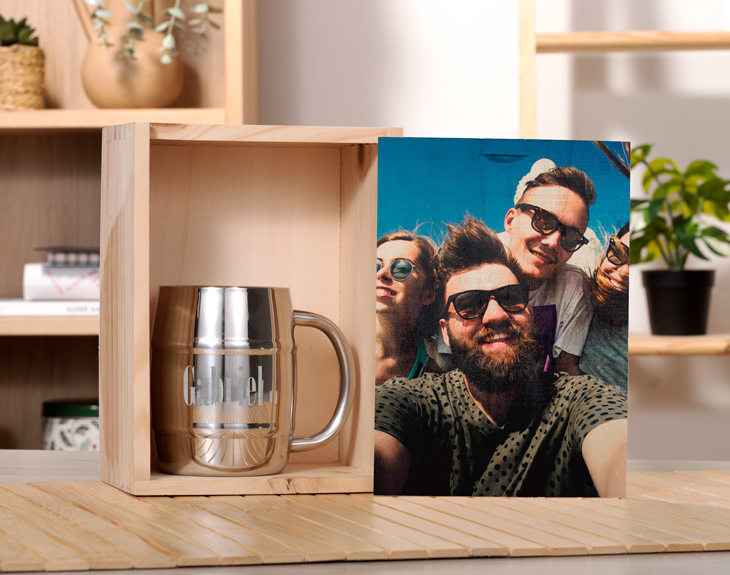 • Caja de madera personalizada. • Jarra de cerveza grabada (450 ml). • Tarjeta Recordatoria.