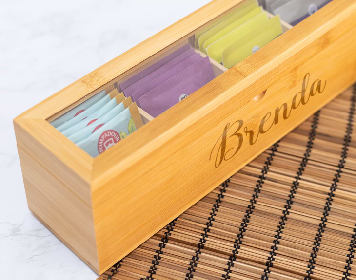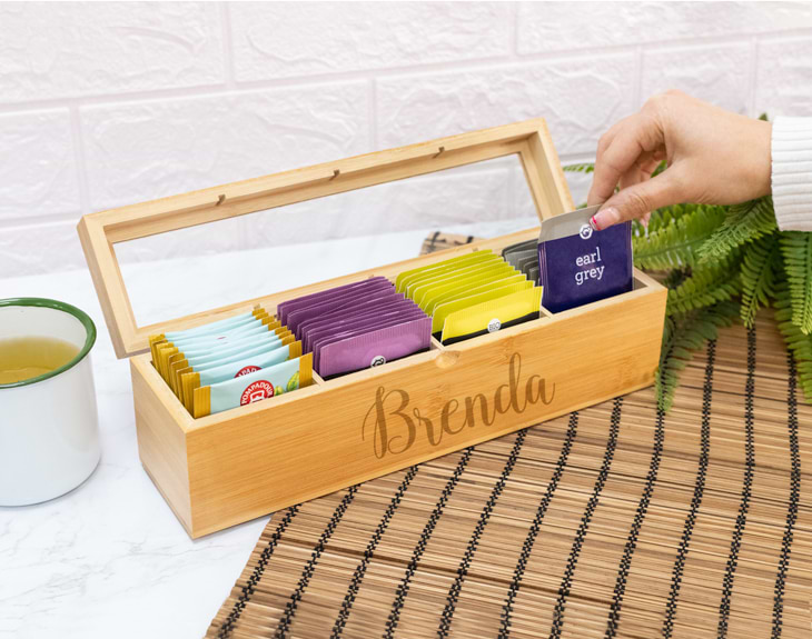 ¿Eres más de café o té? Si inmediatamente has respondido té y eres de esas personas que vive pegada a una taza de té, esta caja de madera personalizada es perfecta para ti. Si no tienes un sitio en tu cocina donde organizar todas las bolsitas de té que tienes, esta caja es el accesorio perfecto para poner en tu cocina o incluso en la oficina. ¡Seguro que tus compañeros te lo agradecen! Esta caja de madera se divide en cuatro compartimentos en los que podrás guardar muchas bolsitas de té. Si necesitas tener organizadas y clasificadas las diferentes bolsitas de té que tienes, necesitas esta original caja de madera grabada. Es genial para darte un capricho o para regalarla a esa persona que no puede vivir sin su buena taza de té. Le encantará recibir esta práctica caja y ver su nombre grabado en ella. ¡Será un regalo de lo más especial! Tiene el tamaño perfecto para poder guardar muchas bolsitas. Además, cuenta con un cristal en su tapa para que puedas ver todas las bolsas de té sin tener que abrir la caja. Si ya estás deseando recibir este regalo y utilizarlo, no te olvides que tienes que personalizar esta caja de madera. Escribe el nombre que quieras y nosotros no encargamos de grabarlo sobre la madera y que quede perfecto. La caja ya estará lista para usar. Cualquier persona fanática del té querría tener esta caja para organizar todas sus bolsitas. ¡Es todo un detallazo! Medidas: 29,5 x 9 x 7,8 cm. Importante: La caja no incluye tés. Importante: Las maderas tienen vetas y estas quedan reflejadas en la imagen.