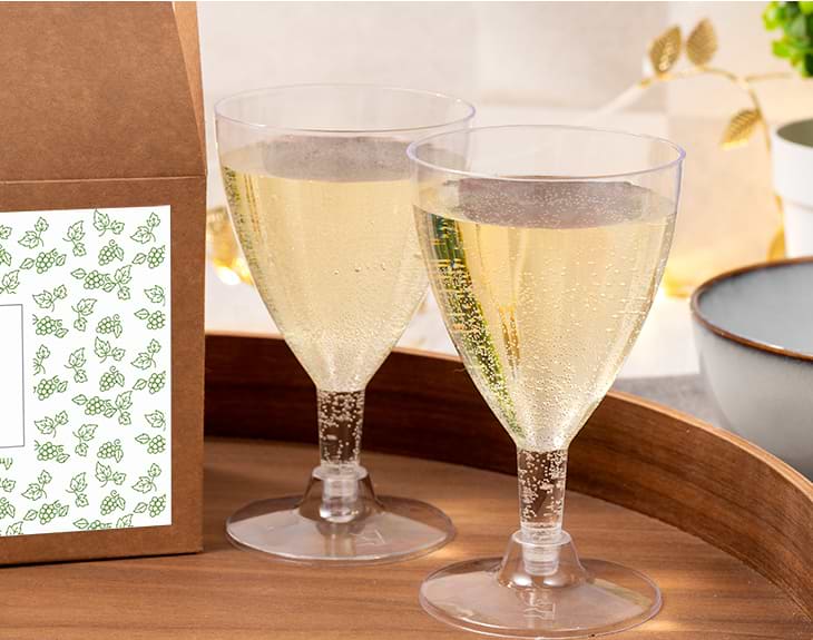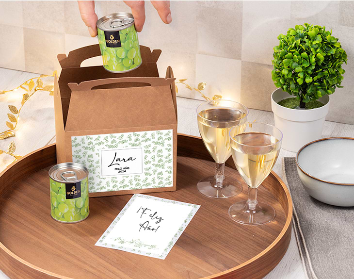 • Caja mix de Nochevieja personalizada. - 2 copas de plástico. - 2 botes de uvas. - Carta (A6). • Tarjeta Recordatoria.
