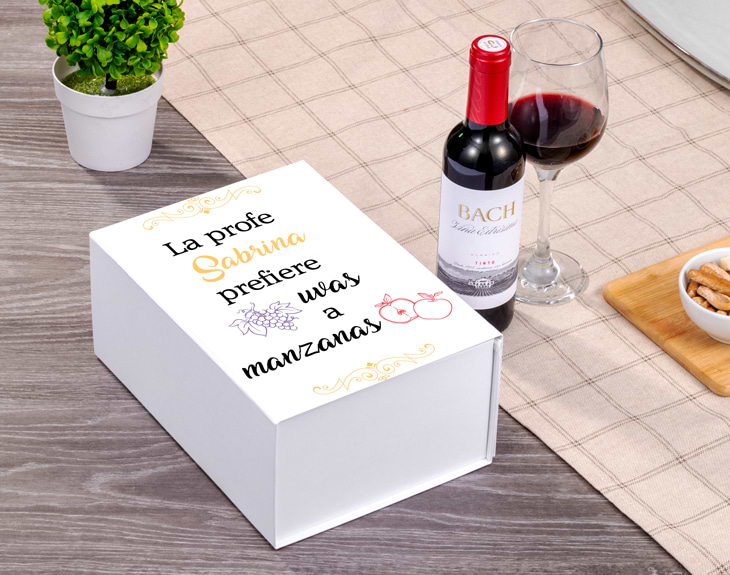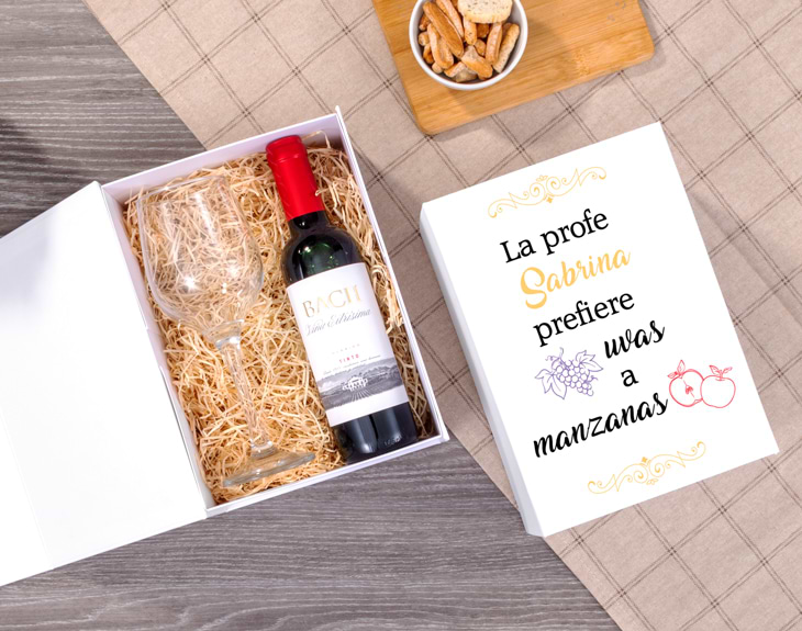 Ya llega la mejor época del año: ¡el verano! El curso llega a su fin y ahora toca despedirse de los compis de clase y de los profesores. Si este año os da muhca pena despediros de vuestro profe con el que habéis aprendido muchas cosas, está claro que tenéis que hacer el mejor regalo de todos. Y para eso nuestro kit premium con bebida personalizado es ideal. Este kit es perfecto para que vuestro profe favorito celebre el fin de curso y el inicio de las vacaciones. Inlcuye una botellita de vino junto con un copa de cristal. ¡Es genial! Además, lo más especial de este kit es que es personalizable, podrás escribir el nombre del mejor profe del mundo, le encantará. Un regalo original para profesores como este será la clave para demostrarle lo duro que ha trabajado a lo largo del curso. Personalizar este pack es muy sencillo. El primer paso a seguir consiste en añadir el producto al carrito y entrar al área de personalización. Una vez ahí, ya puedes escribir el nombre del mejor maestro del mundo. ¡Nosotros nos encargaremos de crear un pack único para él o ella! Medidas de la caja: 25 x 18 x 11 cm.