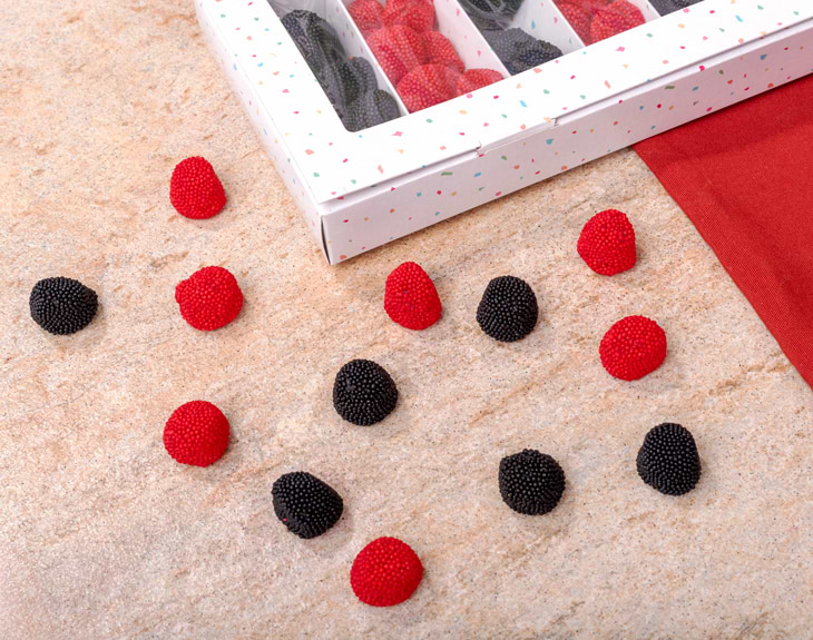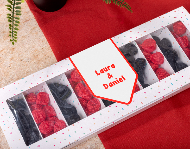 Caja de chuches llena de moras, una de las más ricas que existen. Sus característicos dos colores, su sabor y su textura hacen de esta caja un regalo original, perfecto para sorprender a una persona amante de las cosas dulces. Para que el regalo sea aun más único, te damos la opción de personalizar la caja con un vinilo con tu foto o el mensaje que quieras. ¿A quién no le hace ilusión una montaña de chuches? Este producto está disponible en dos formatos: - Caja de chuches: 23 x 13 x 3 cm 40 chuches aprox. (Tapa opaca) - Caja de chuches XL: 37 x 13 x 3 cm 70 chuches aprox. (Tapa transparente) Importante: si puedes tener reacción a cualquier tipo de alérgenos, puedes escribirnos para consultar si hay alguna opción alternativa.