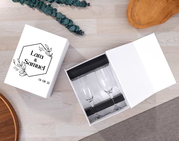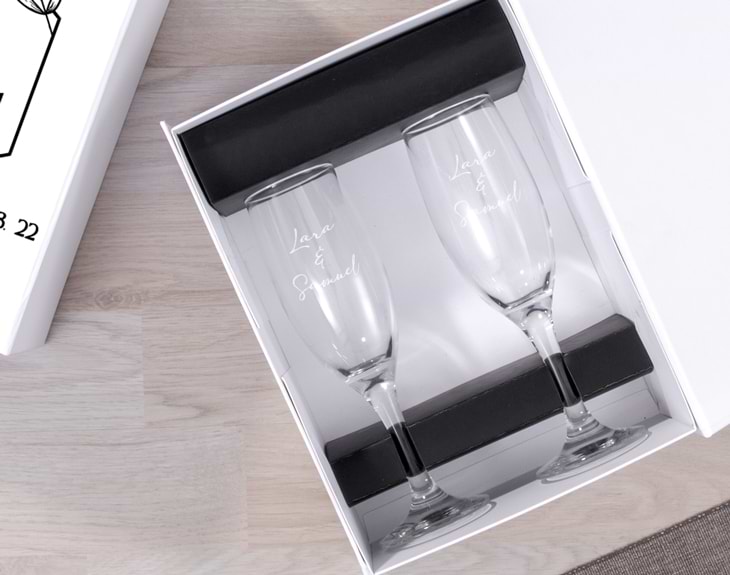 • Caja de cartón blanca (25x18x11cm). • Copa de cristal de cava grabada. • Tarjeta Recordatoria.
