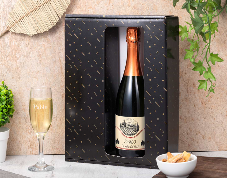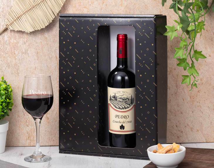 • Caja de cartón negra (27x36x7cm). • Botella de vino o de cava personalizada 750ml. • Copa de cristal de vino o de cava. • Tarjeta Recordatoria. IMPORTANTE: prohibida la venta de bebidas alcohólicas a menores de 18 años.